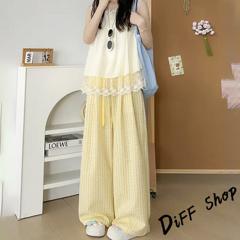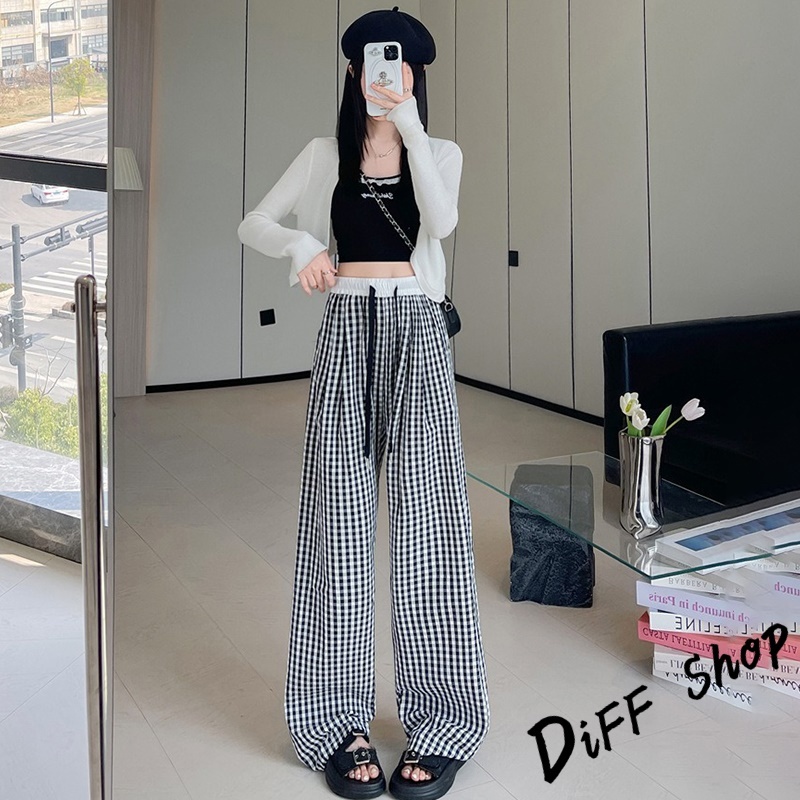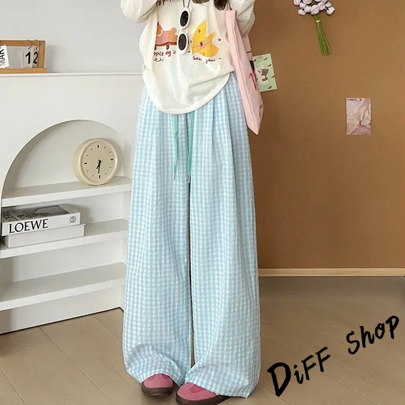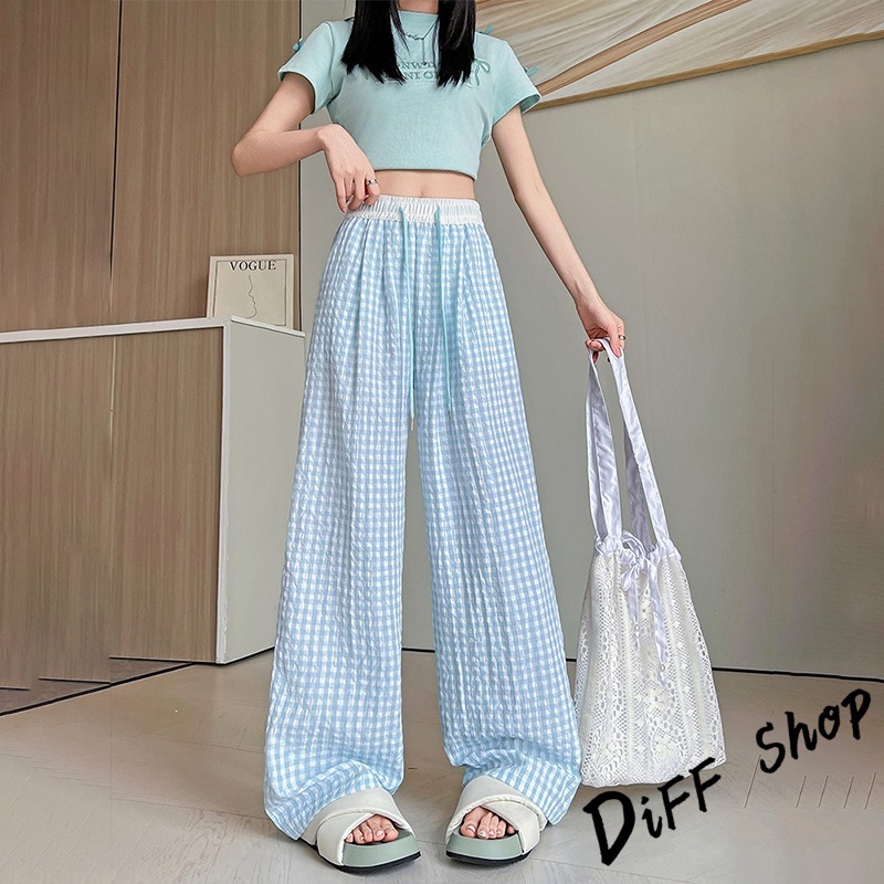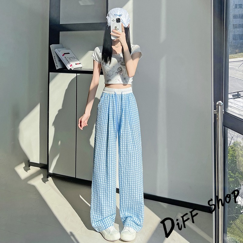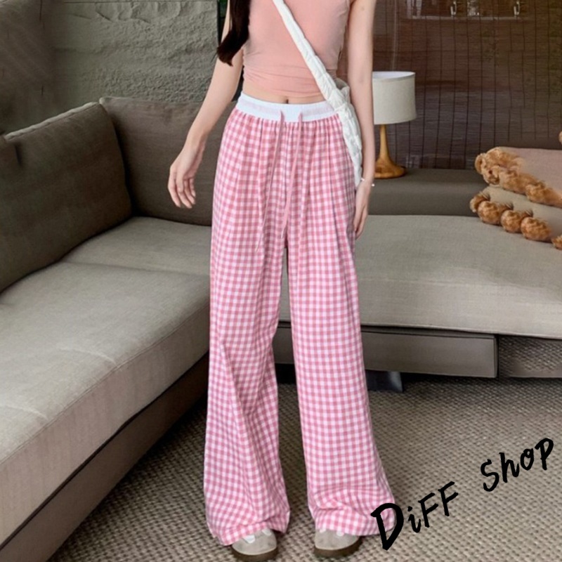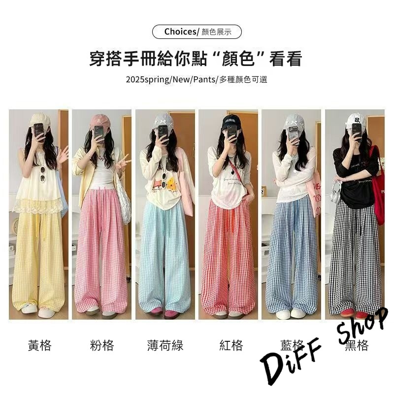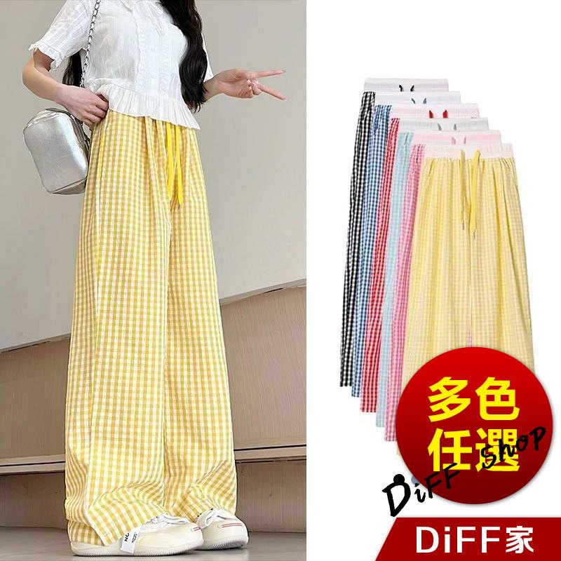 【DIFF】韓版薄款垂墜感格紋褲 寬褲 褲子 長褲 休閒褲 女裝 高腰褲 拖地褲 直筒褲【P378】【P378】紅色|【P378】淺綠色|【P378】黃色|【P378】藍色|【P378】粉色|【P378】黑色PantsDiFF shop
