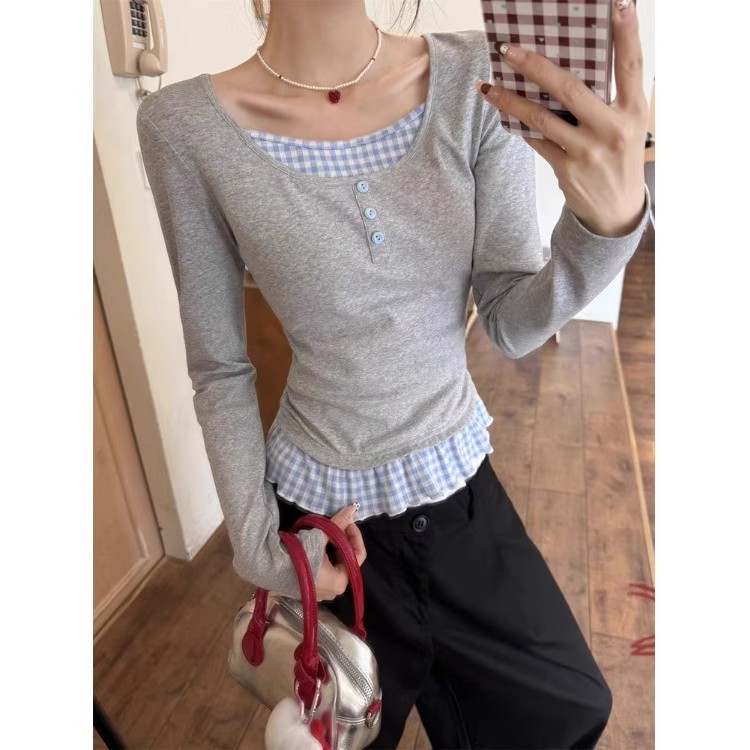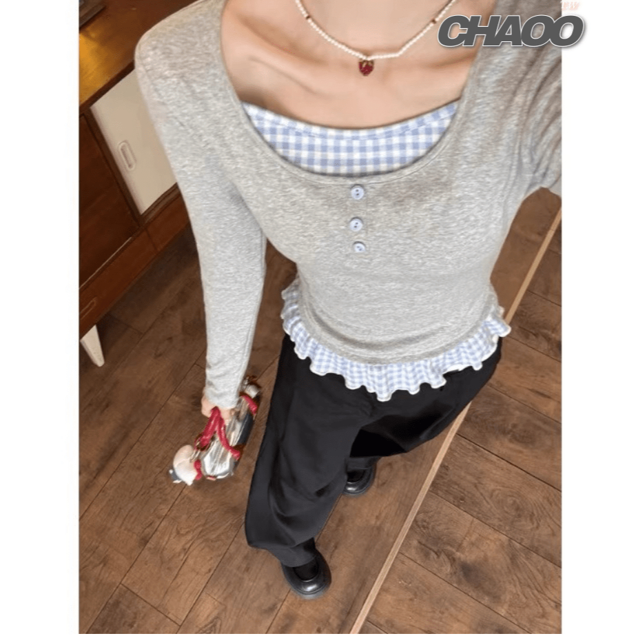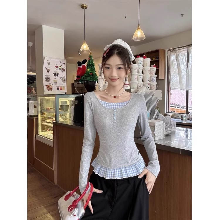 心動指數100%~ 長袖 假兩件上衣 淺灰拼藍格子 法式裙擺 辣妹 韓系上衣女 韓版 y2k 衣服 氣質上衣 設計感衣服主圖款【假兩件】,F|優質版主圖款【假兩件】,FT-shirtsCHAOO 台北原創服飾品牌