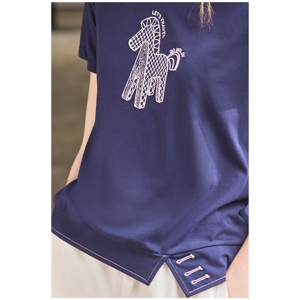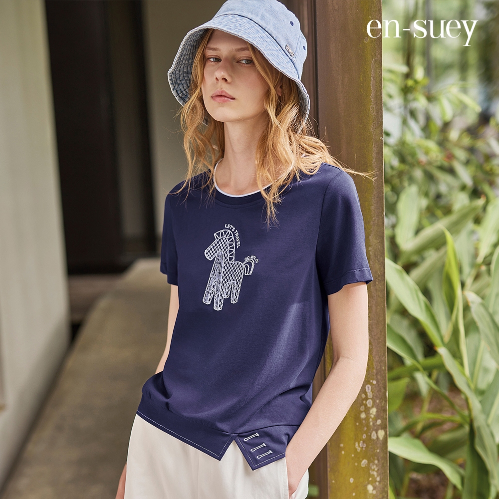 【en-suey 銀穗】木馬繡花單邊開衩上衣 – 白/藍 5213-1218白,M|白,L|白,XL|藍,M|藍,L|藍,XLT-shirtsen-suey 銀穗