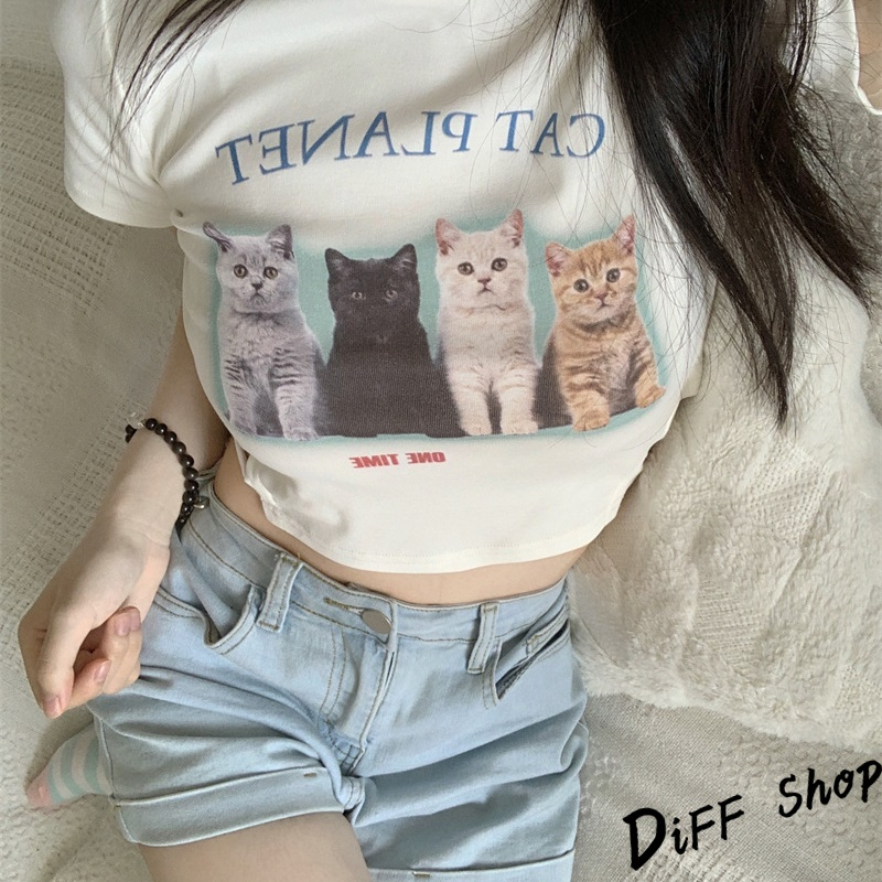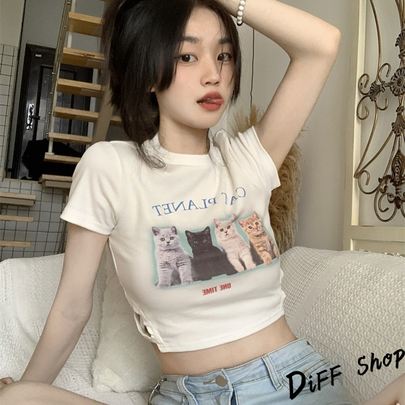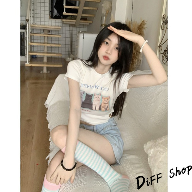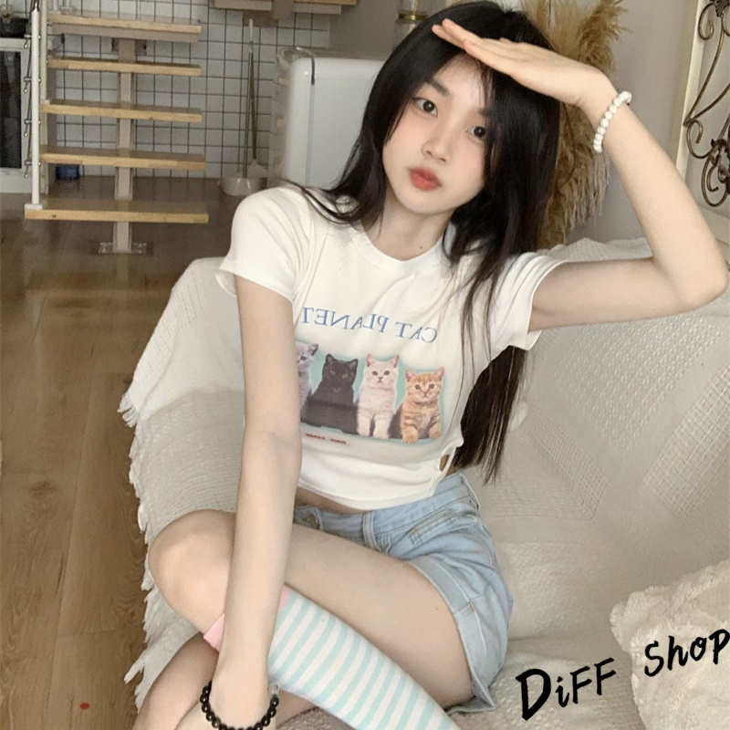 【DIFF】韓版側邊簍空貓咪短版上衣 短袖上衣 短袖t恤 女裝 顯瘦上衣 衣服 寬鬆上衣 素T 短板上衣【T558】【T558】白色T-shirtsDiFF shop