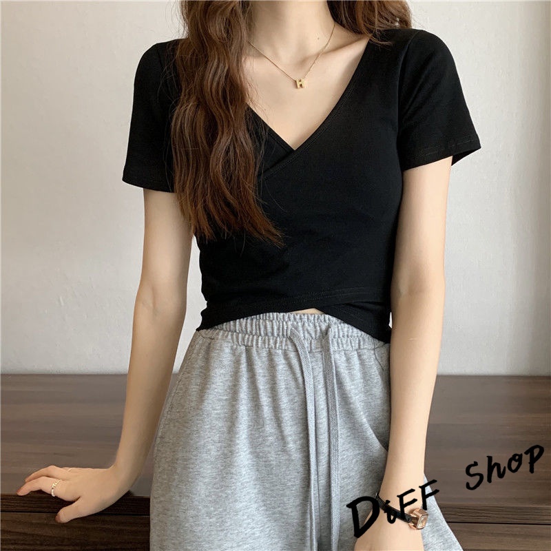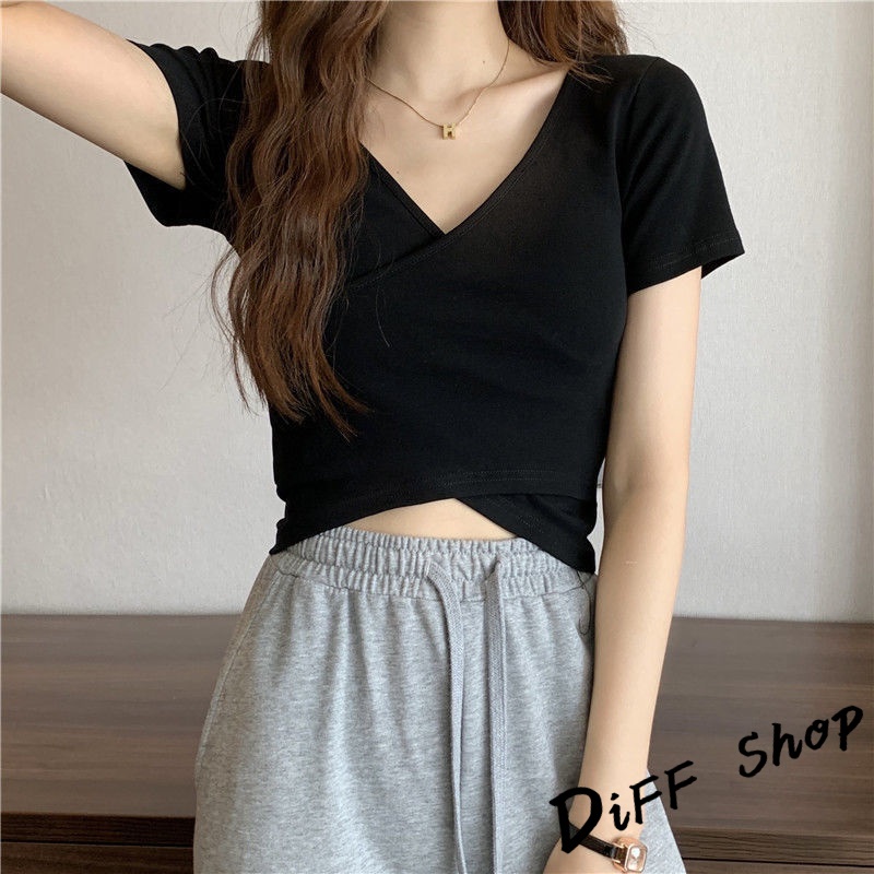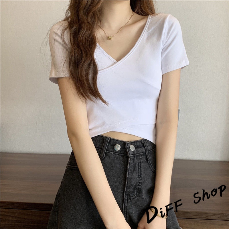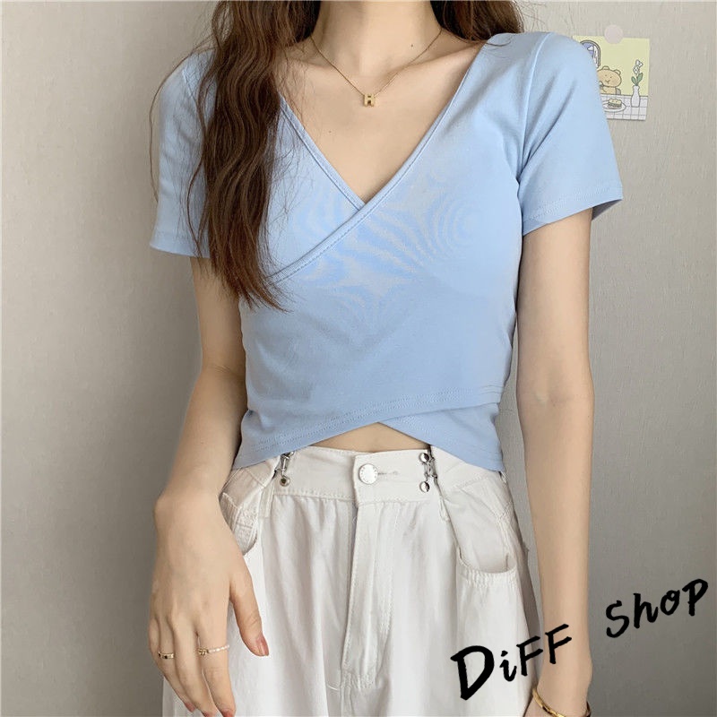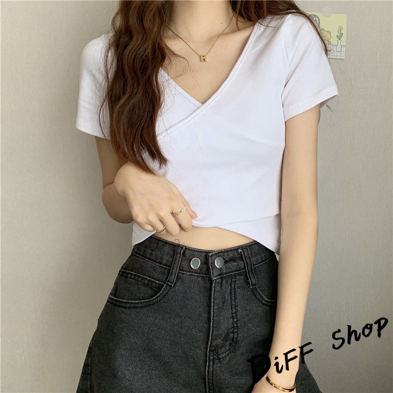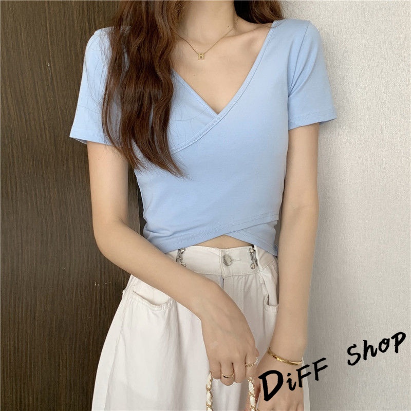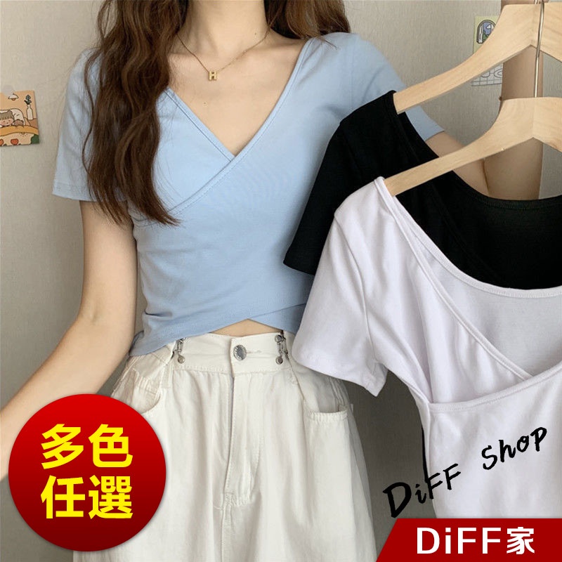 【DIFF】韓版設計交叉素色顯瘦短版上衣 短袖上衣 短袖t恤 女裝 顯瘦上衣 衣服 寬鬆上衣 素T 短板上衣【T476】【T476】黑色|【T476】白色|【T476】淺藍T-shirtsDiFF shop