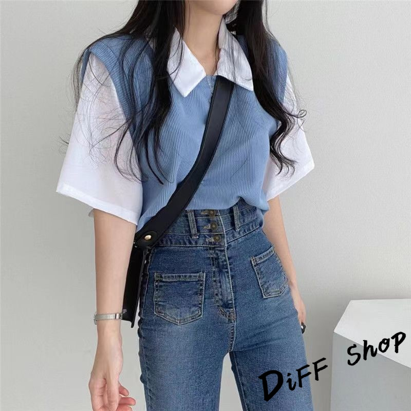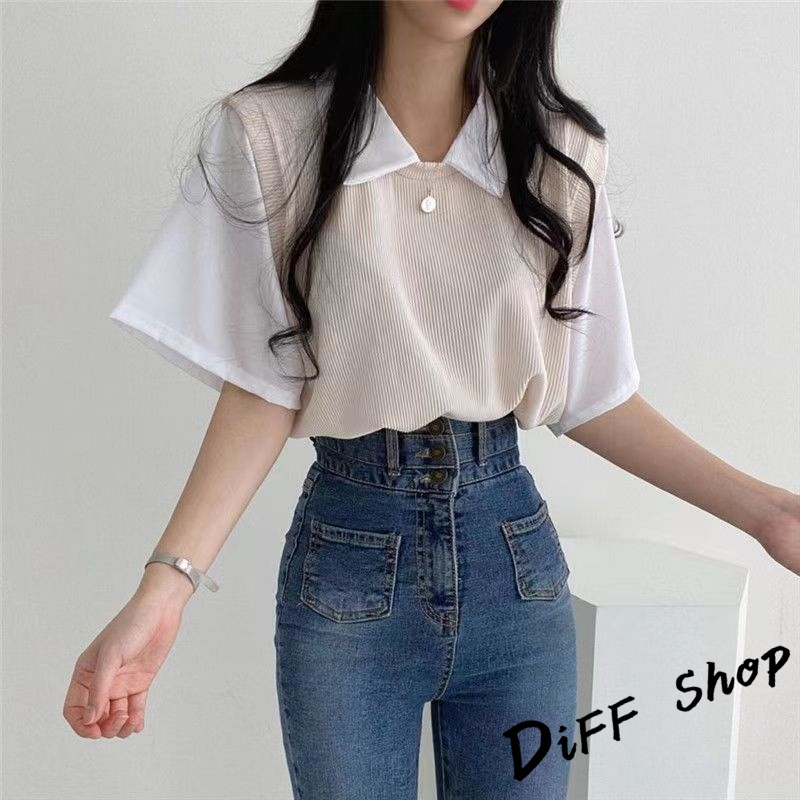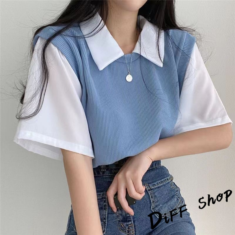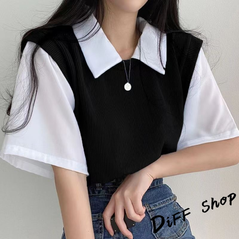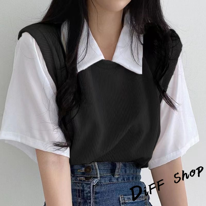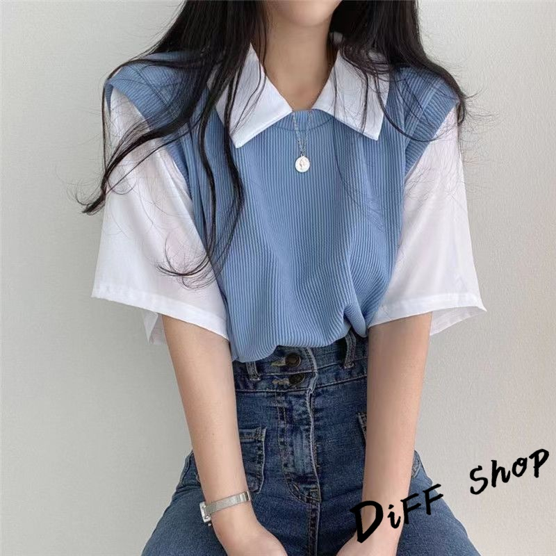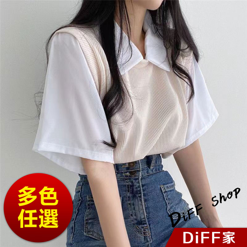 【DIFF】韓版學院風撞色假兩件短袖上衣 短袖t恤 女裝 顯瘦上衣 衣服 寬鬆上衣 素T【T498】【T498】藍色|【T498】杏色|【T498】黑色T-shirtsDiFF shop