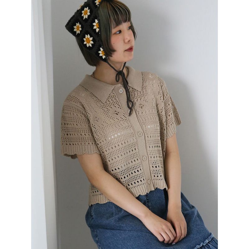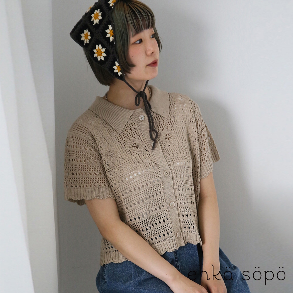 ehka sopo 洞洞鏤空短袖翻領針織開襟上衣(0F000888210)象牙色F|米色F|棕色F|綠色FT-shirtsearth music&ecology Select Store