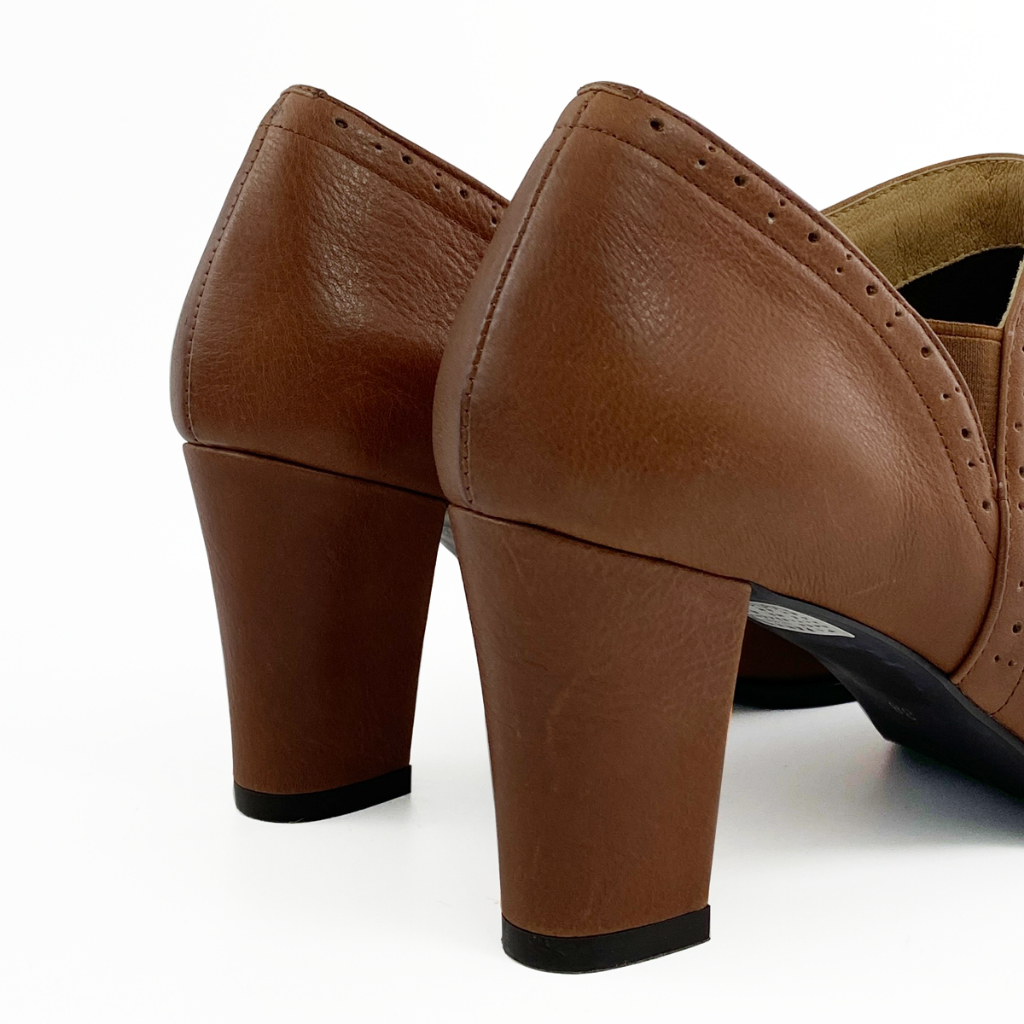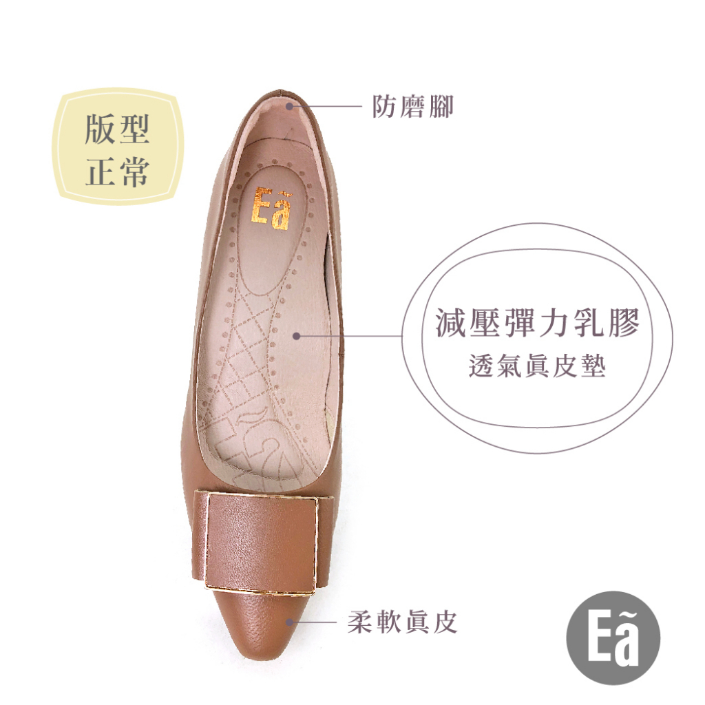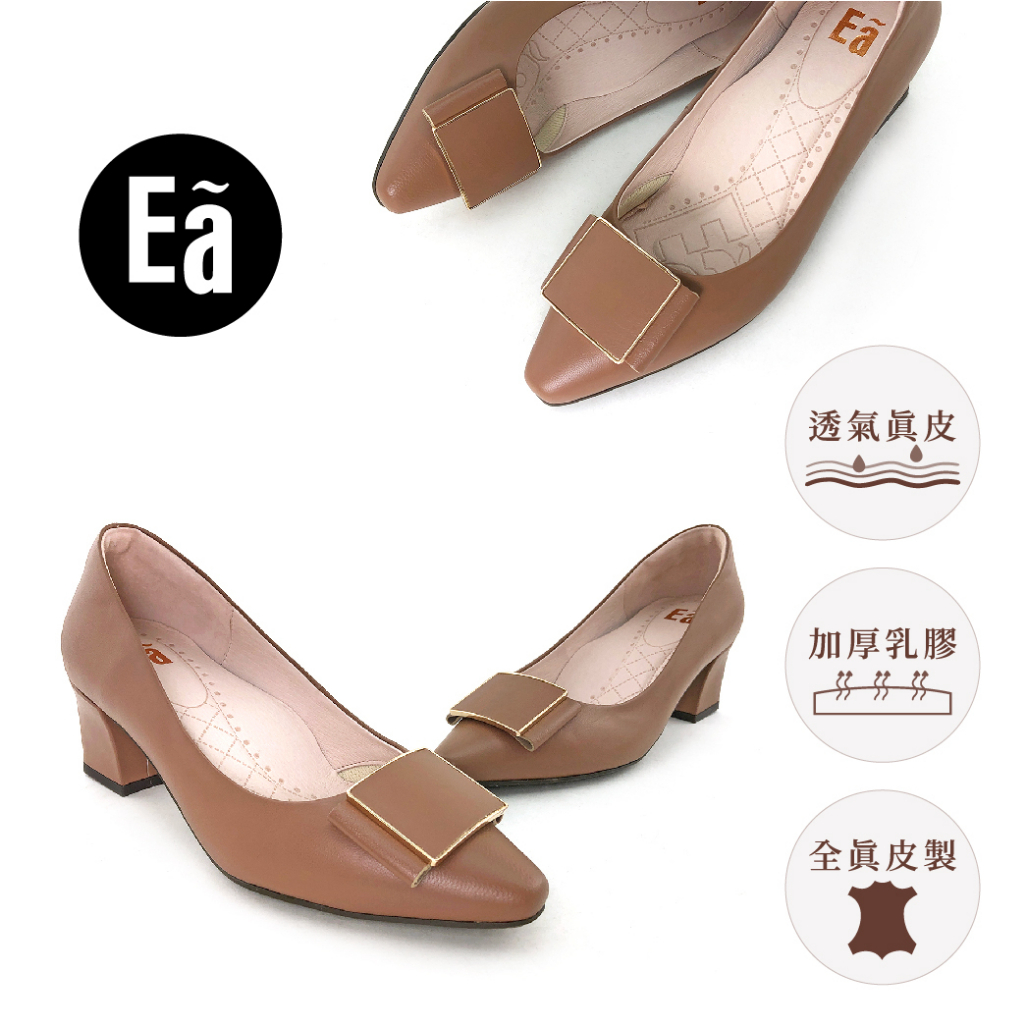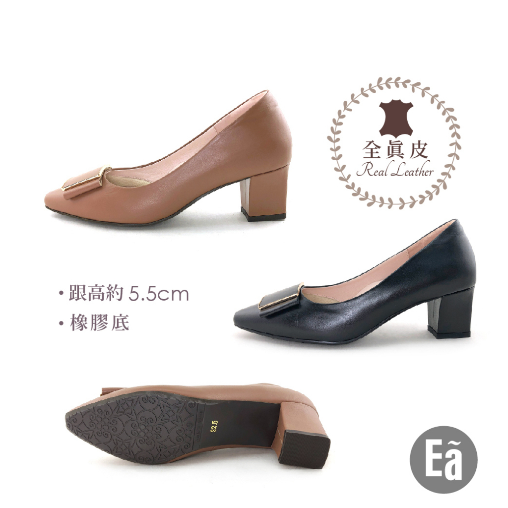 Ea專櫃女鞋 優雅日風 真皮素面小方頭金屬方釦 中跟鞋 粗跟鞋(棕紅)9110