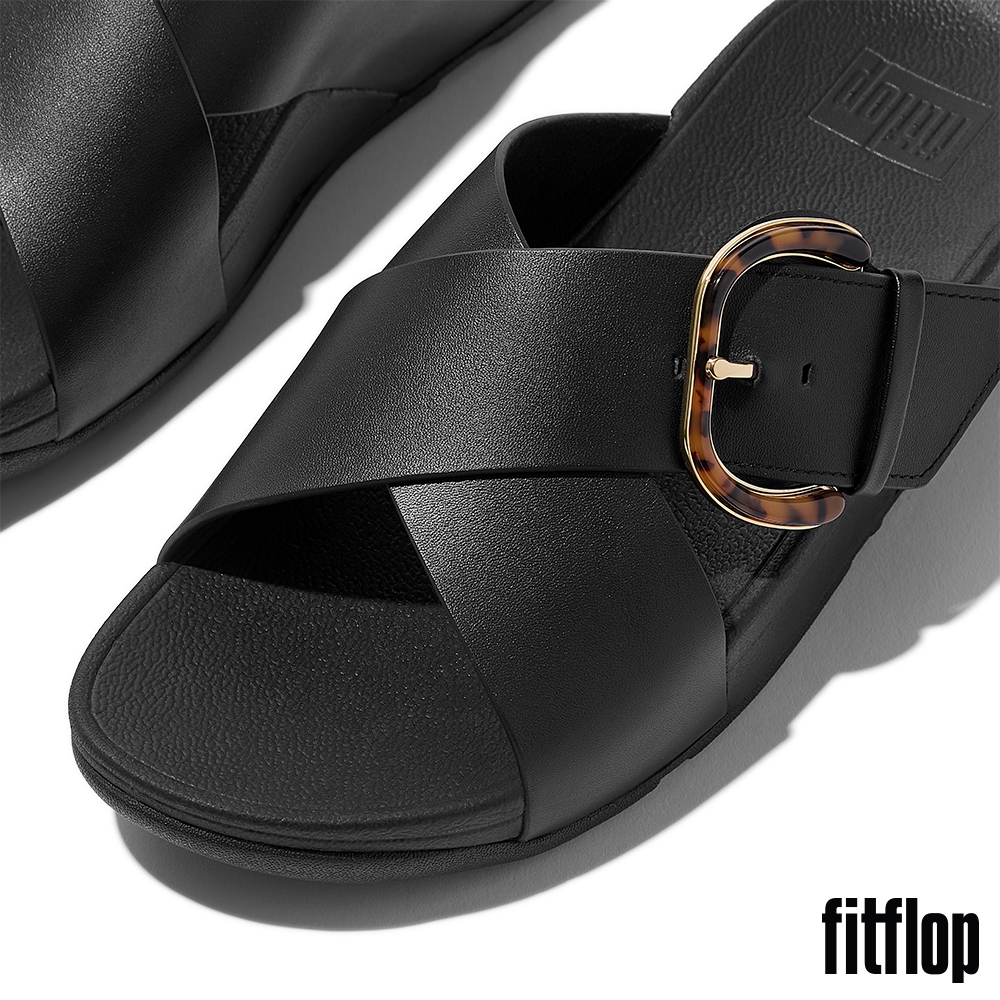 【FitFlop】LULU 樹脂扣環皮革交叉涼鞋-女(靚黑色)