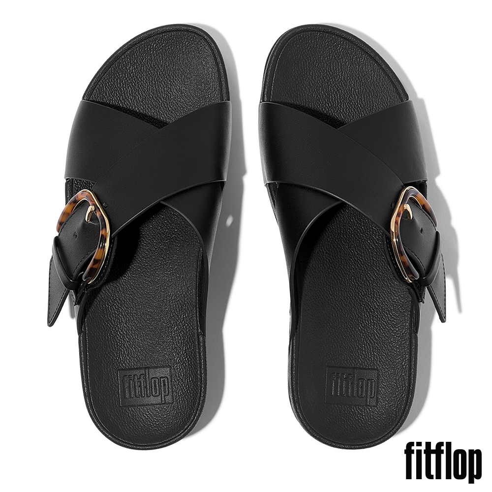 【FitFlop】LULU 樹脂扣環皮革交叉涼鞋-女(靚黑色)US5|US6|US7|US8|US9Flat SandalsFitFlop官方旗艦店