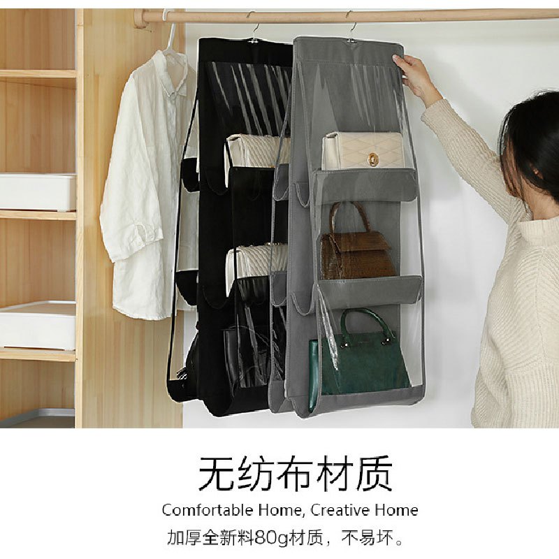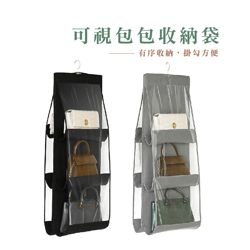 衣櫥雙面六格包包收納袋 收納掛架 收納架 掛袋 包包收納 置物袋 透明 分隔收納 防塵 掛式 衣飾收納_DH016包包掛袋_灰(三層)|包包掛袋_黑(三層)|包包掛袋_黑(四層)Wardrobe OrganizersFS生活品專賣