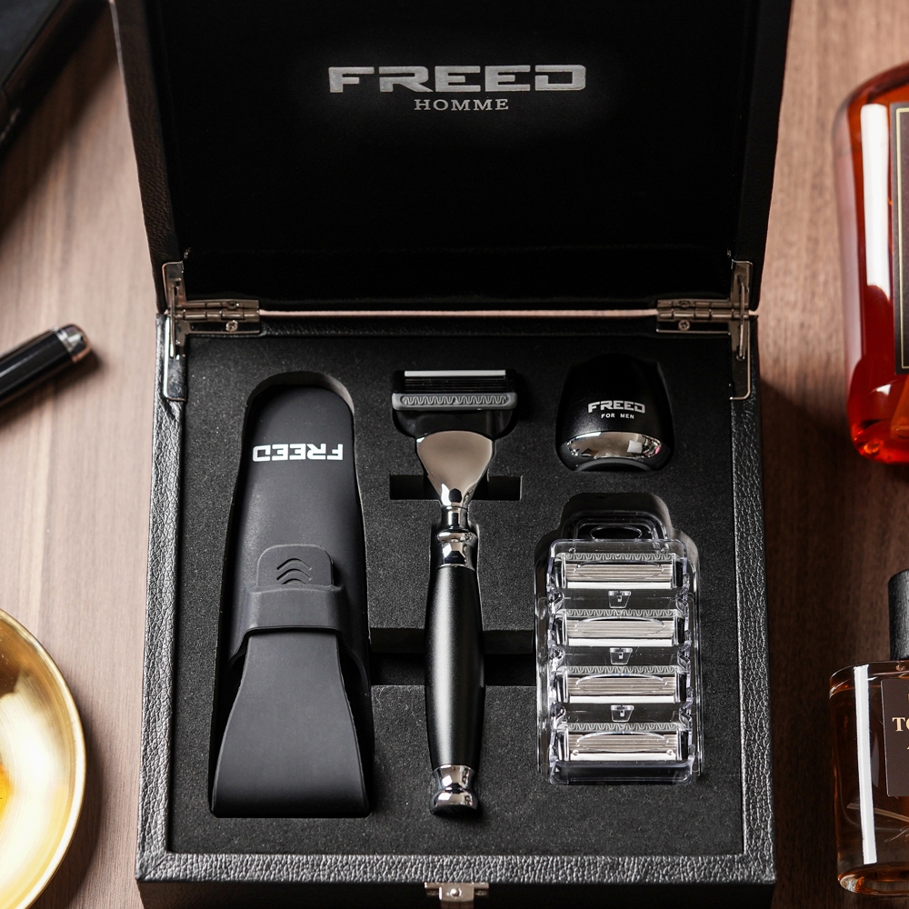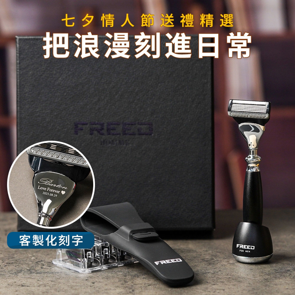 【FREED】五刀式刮鬍刀尊爵四件組禮盒 極致黑 客製化 刻字 七夕 父親節 送禮 生日 男生 男性 禮物推薦 情人節加購刻字(390元)|不需要加購刻字Shaving & GroomingFREED男士刮鬍刀第一品牌