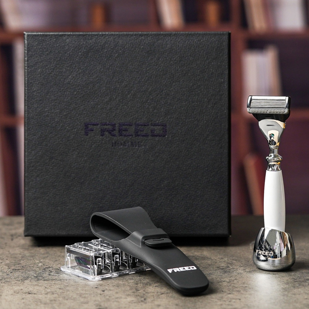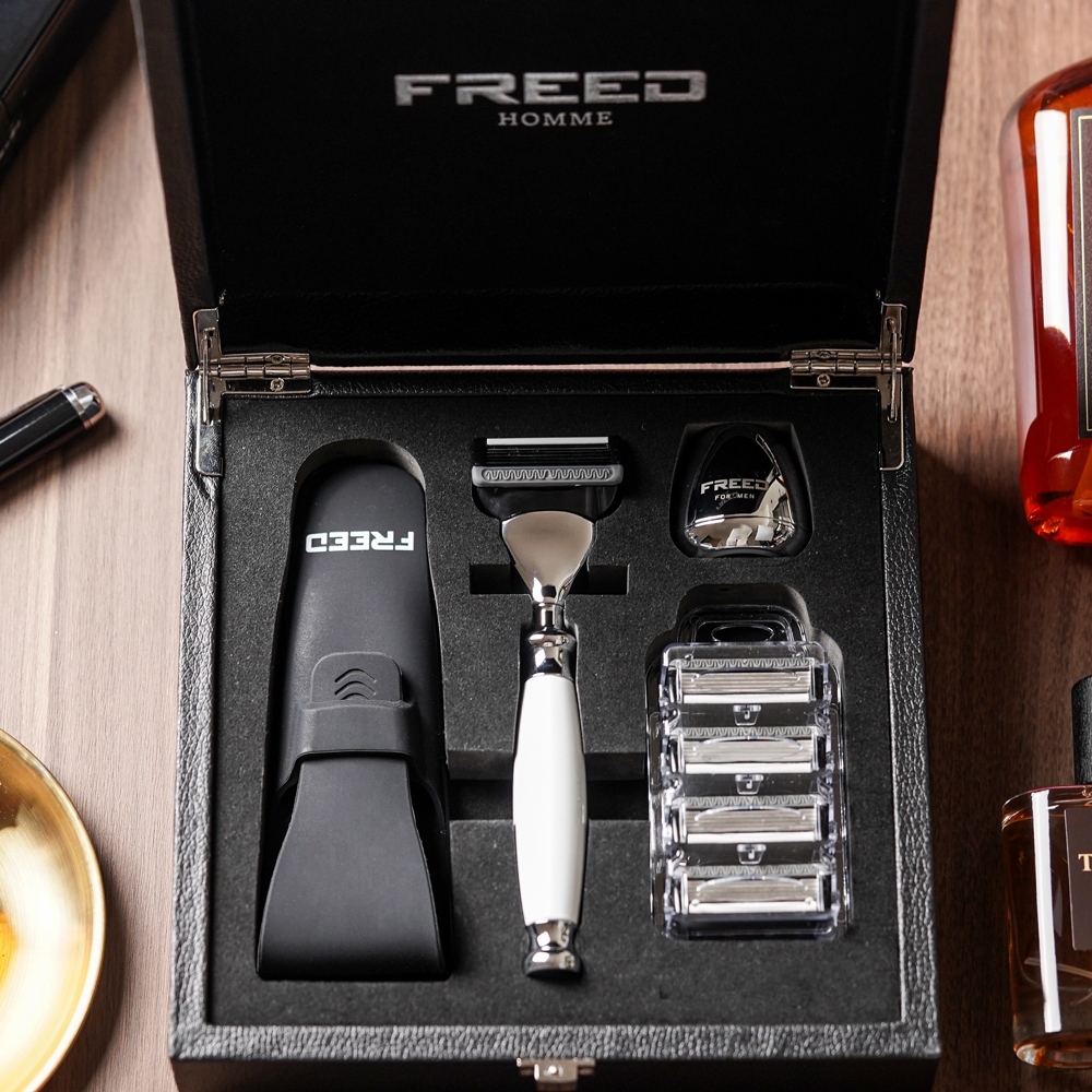 【兩週年特仕款】尊爵四件組五刀式刮鬍刀禮盒-珍珠白 客製化 刻字 七夕 父親節 送禮 生日 男生 男性 禮物推薦 情人節免費刻字(留言訂單備註區)|不需刻字Shaving & GroomingFREED男士刮鬍刀第一品牌