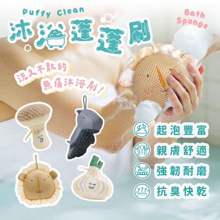 Puffy Clean 沐浴蓬蓬刷 | 起泡綿密 按摩沐浴球 抗菌防霉 兒童沐浴球 搓澡球 起泡球 沐浴刷Vegan系列 菇摸擰(兒童適用)|Vegan系列 蒜泥白肉(兒童適用)|Zoo系列 河馬拭(兒童適用)|Zoo系列 獅垢移(兒童適用)Bath Brushes & LoofahsFOSFIT|健康生活養成