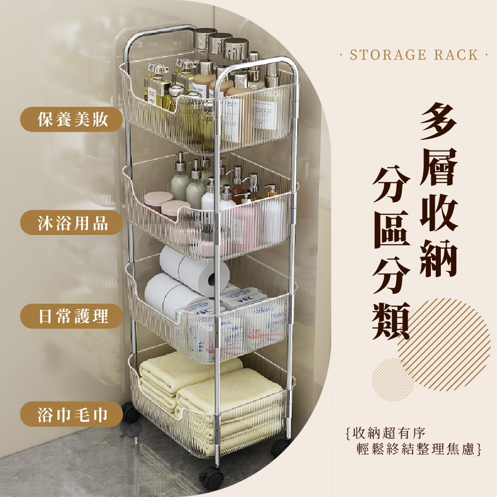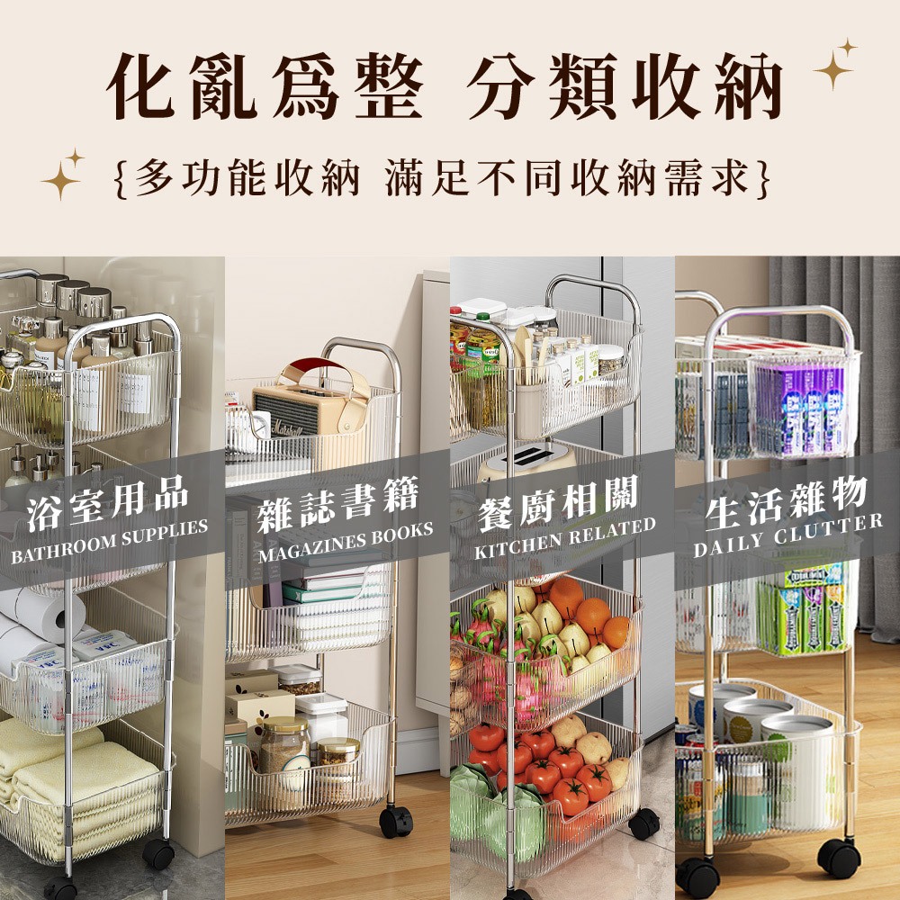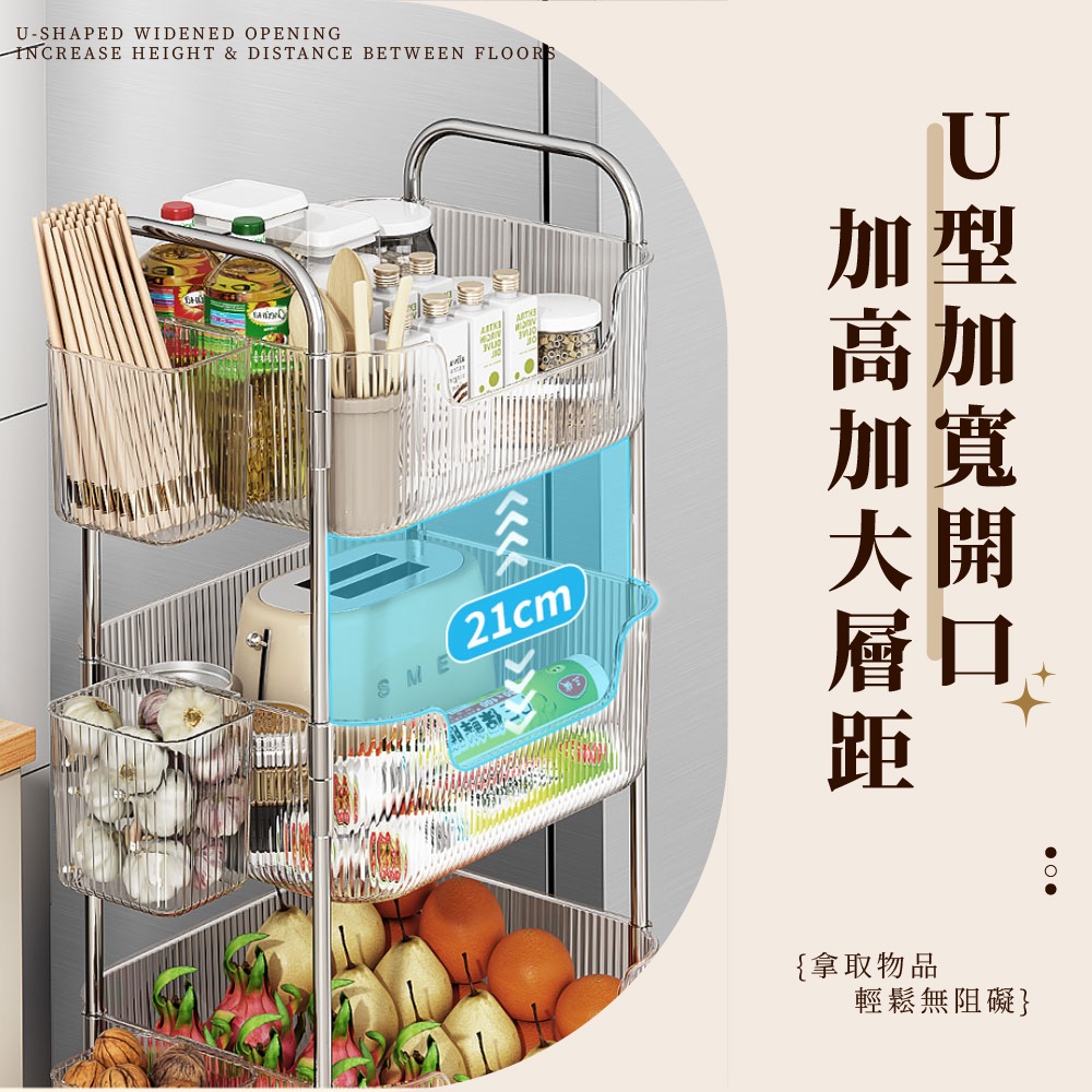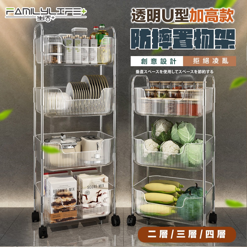 【FL生活+】透明U型加高防摔置物架系列 附輪子 手推車 推車 附掛籃 收納 廚房收納 衛浴收納 置物車 收納車 層架雙層款-(超取限1入)|3層款(限宅配)|4層款(限宅配)|雙層款附2個掛籃-(超取限1入)|3層款附3個掛籃(限宅配)|4層款附4個掛籃(限宅配)Shelves & RacksFL生活+ 官方直營旗艦店