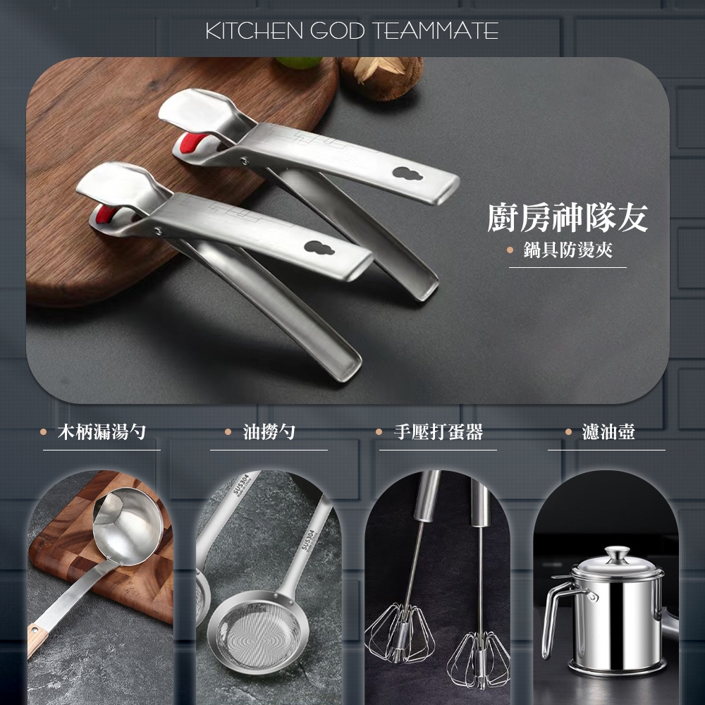 【FL生活+】304不鏽鋼廚房料理工具系列款 防燙夾 油撈勺 打蛋器 湯勺 廚房用具 料理用具 取盤夾304不鏽鋼防滑鍋具防燙夾|304不鏽鋼油撈勺-小號|304不鏽鋼油撈勺-大號|304不鏽鋼手壓旋轉打蛋器-小號|304不鏽鋼手壓旋轉打蛋器-大號|304不鏽鋼木柄漏湯勺Spatulas & Cooking TweezersFL生活+ 官方直營旗艦店