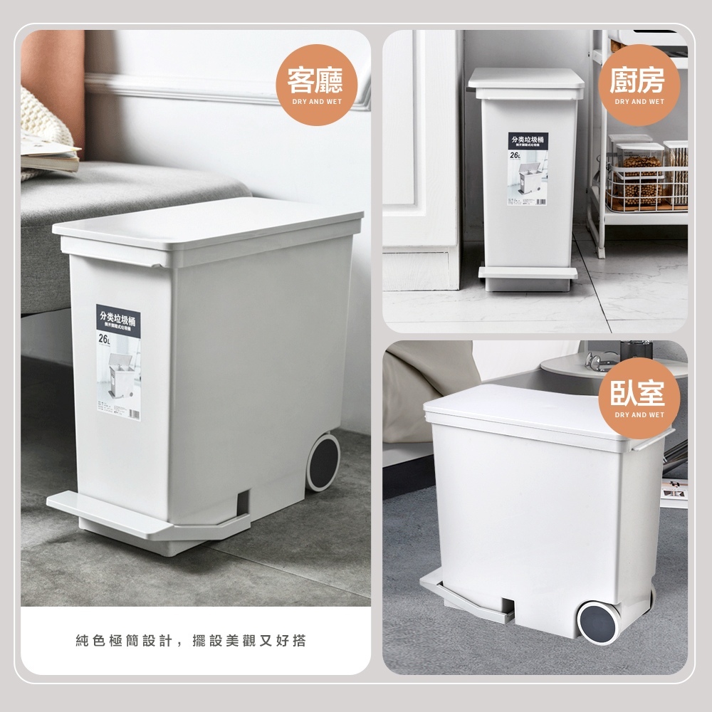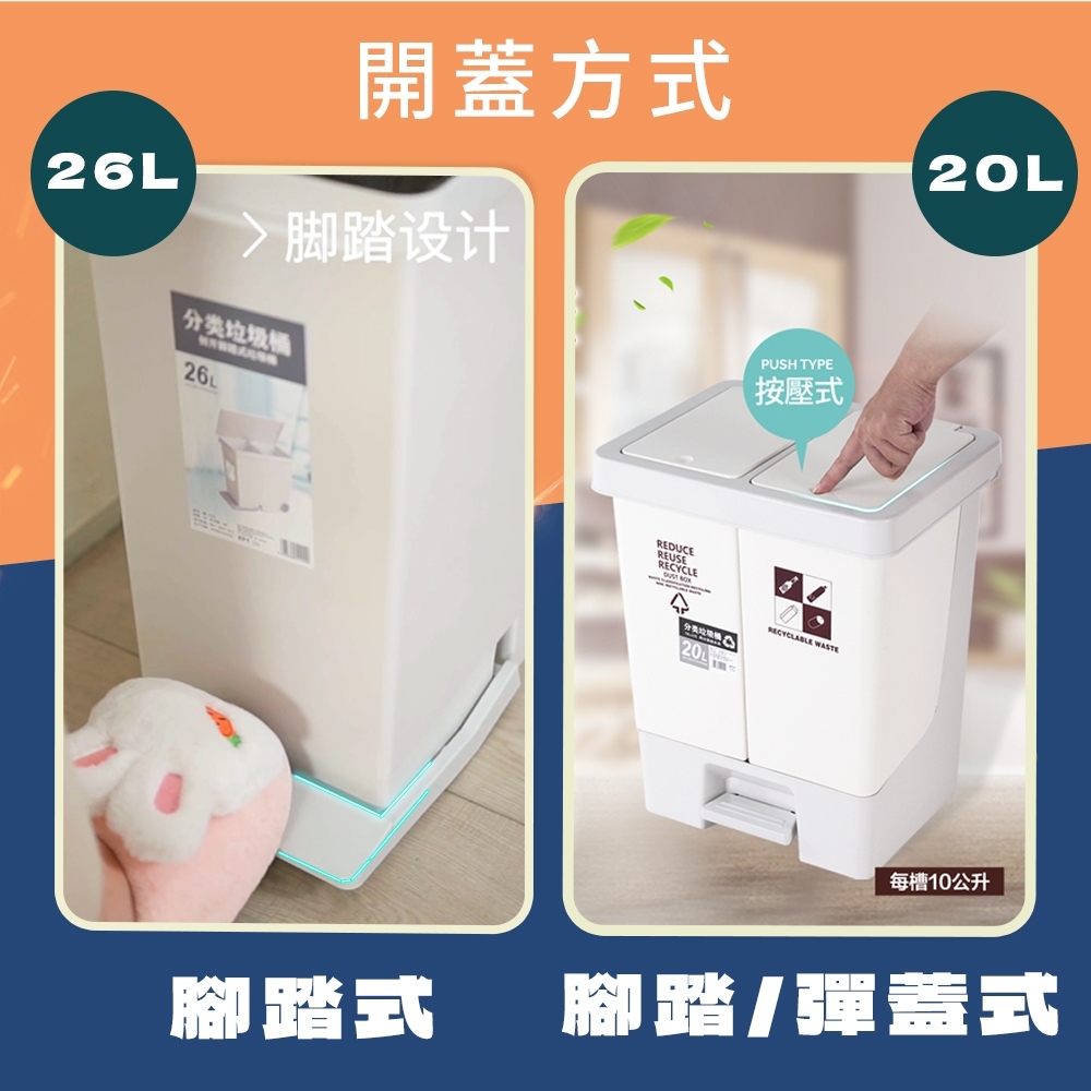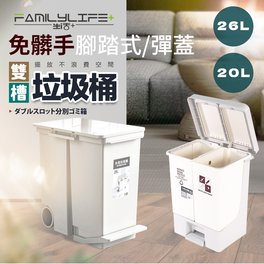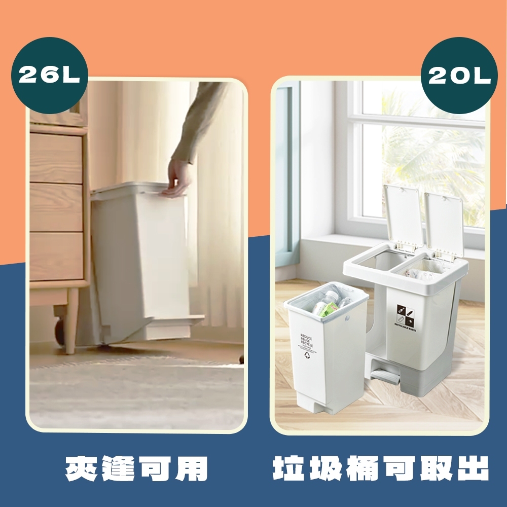 【FL生活+】免髒手腳踏/彈蓋2用雙槽分類垃圾桶20L 26L 回收垃圾桶 垃圾桶 窄垃圾桶 腳踩垃圾桶 夾縫垃圾桶