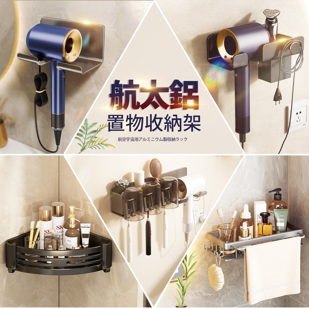 【FL生活+】簡約風航太鋁衛浴收納置物架 廚房收納架 牙刷架 層架 瀝水架 無痕掛勾 無痕貼 免釘膠 鍋蓋架 刀具架