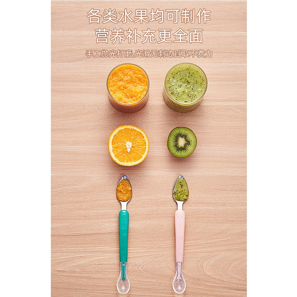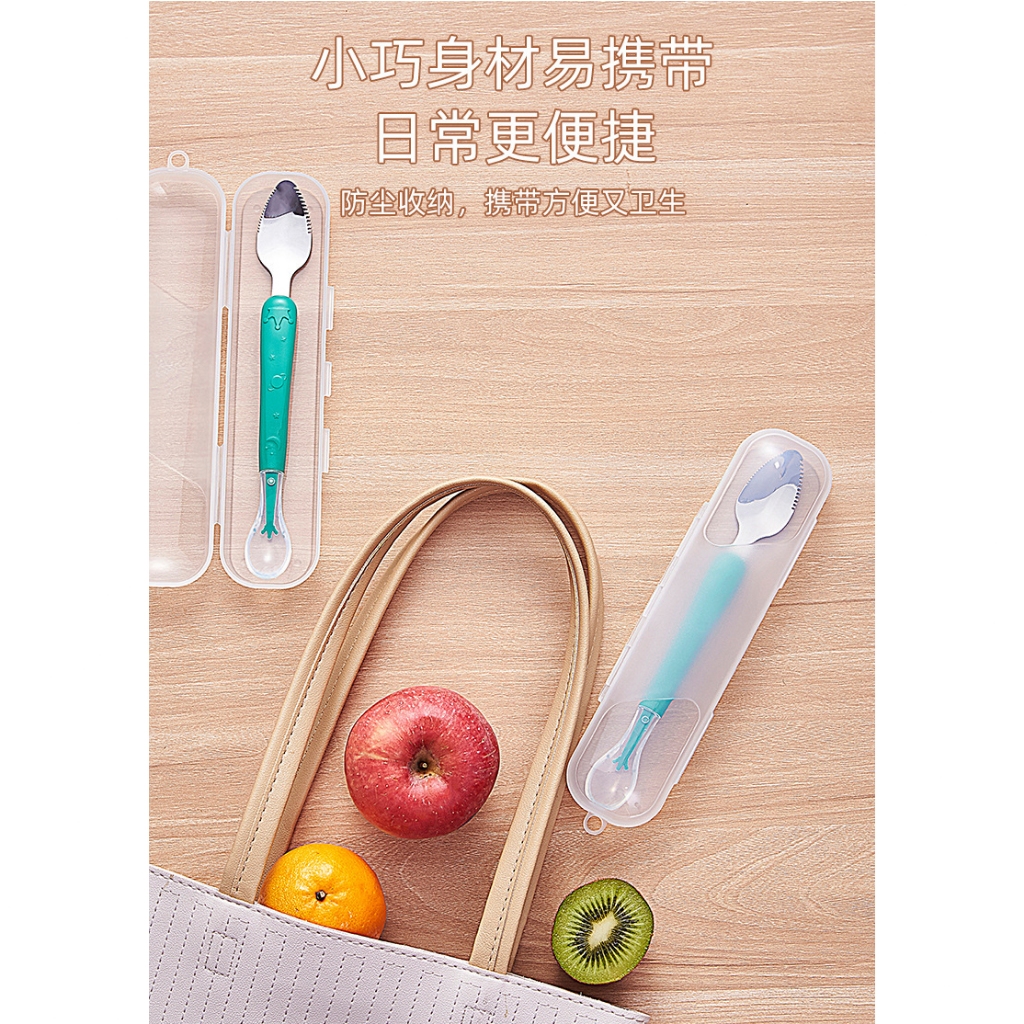 包含外盒 雙頭刮果泥湯匙 不鏽鋼水果刮泥勺 矽膠勺子 寶寶輔食勺 兩用勺子 雙頭蘋果泥勺子 副食品_DA006寶寶刮泥湯匙(帶盒)CutleriesFS生活品專賣