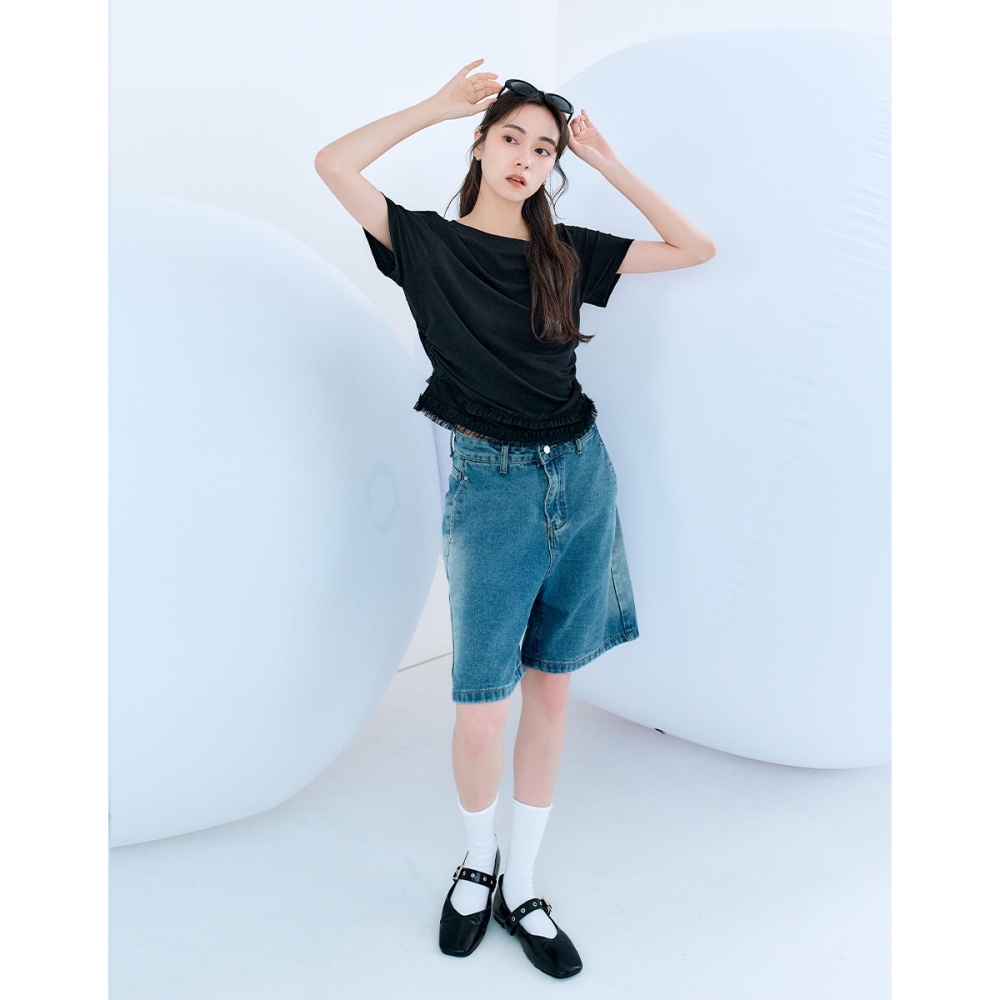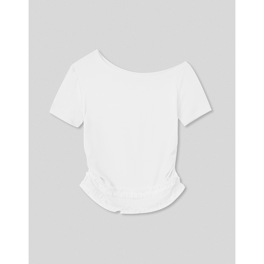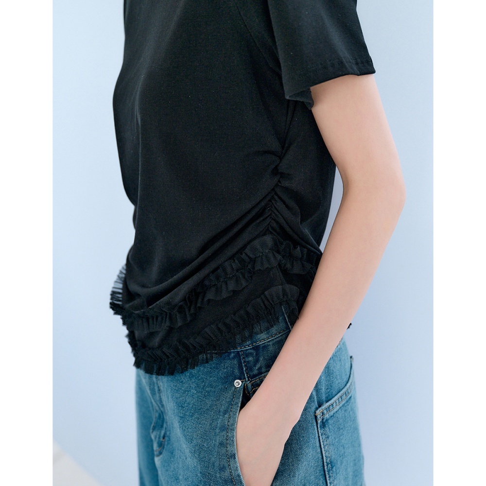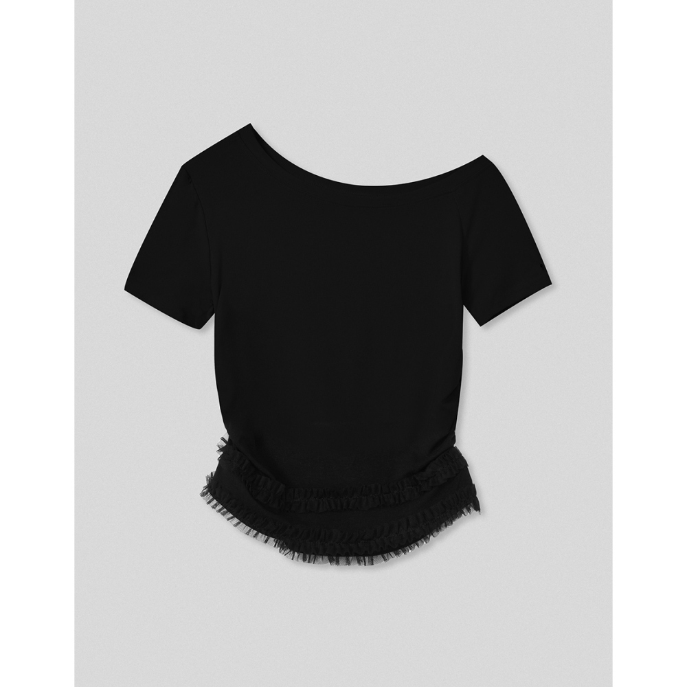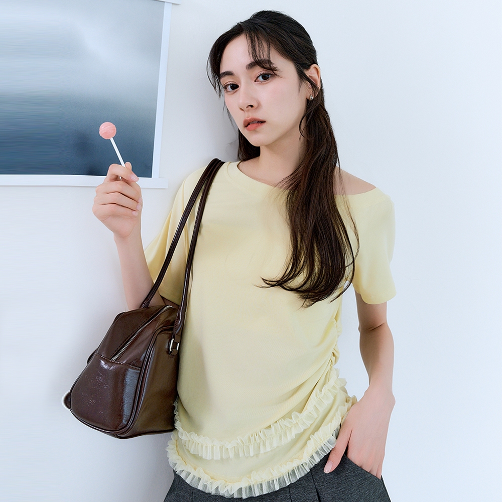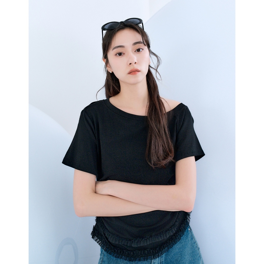 CC.DAILY-斜肩拼接網紗側抽皺上衣(三色)-女【J2CO140】01白,S|01白,M|09黑,S|09黑,M|50鵝黃,S|50鵝黃,MT-shirtscaco_tw