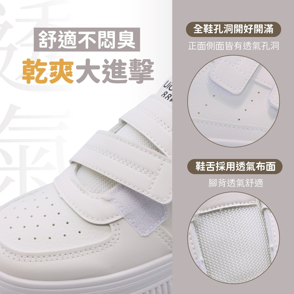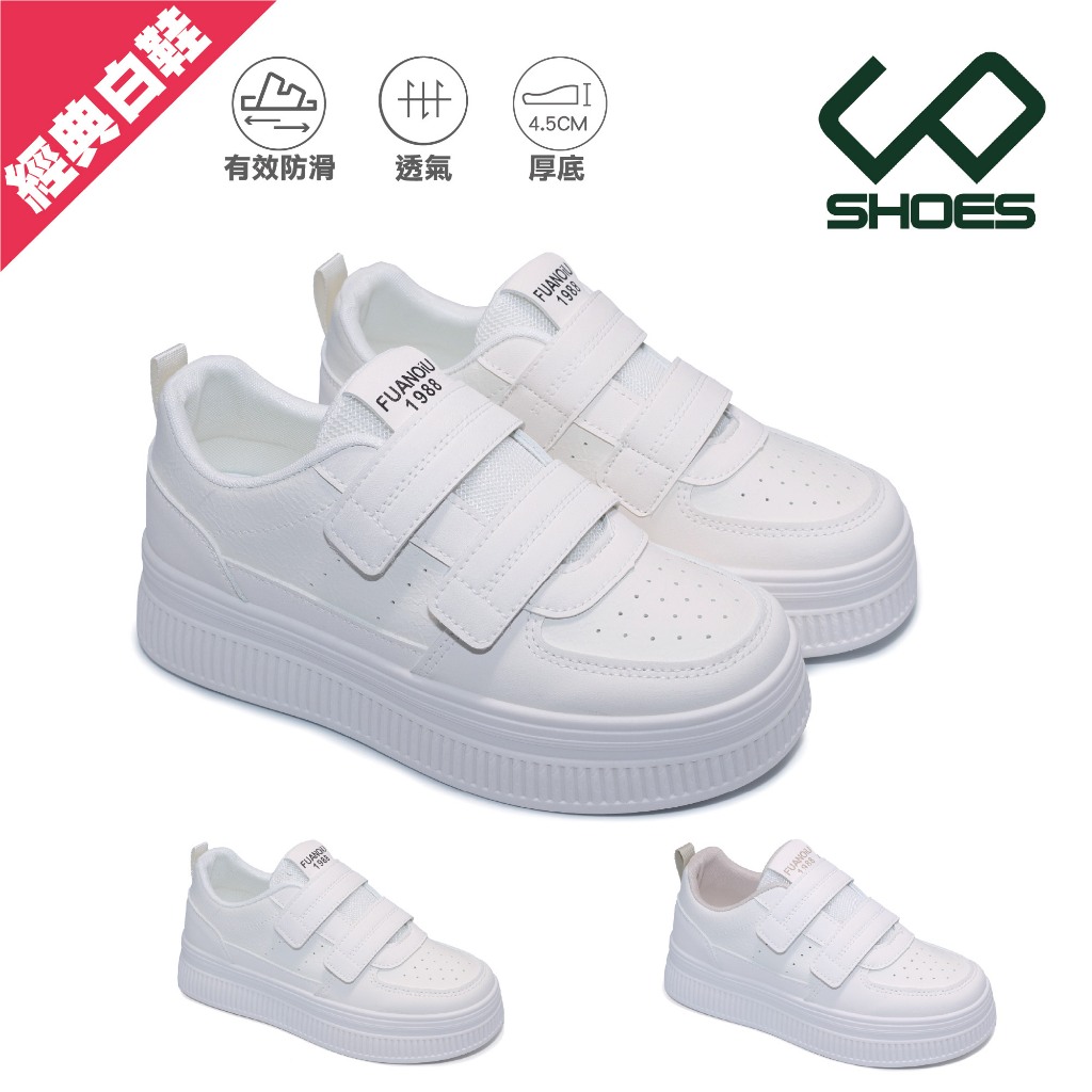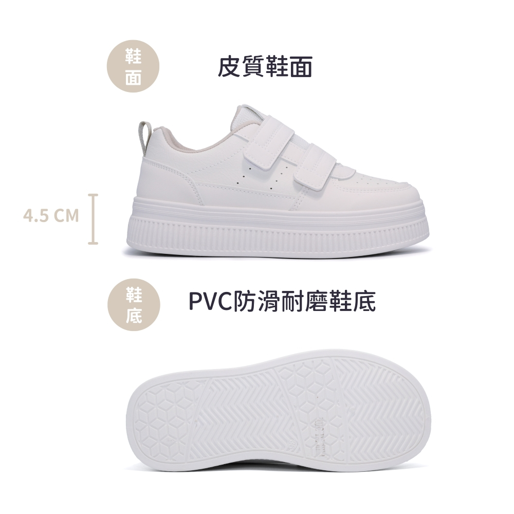 C&D 女鞋 4.5CM透氣皮面魔鬼氈厚底小白鞋 休閒鞋 運動鞋