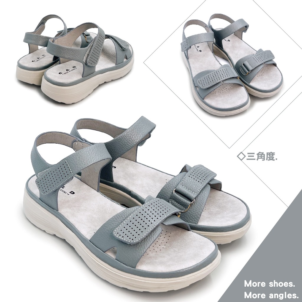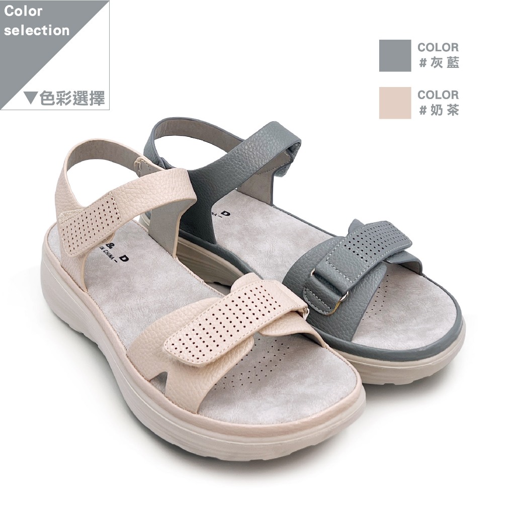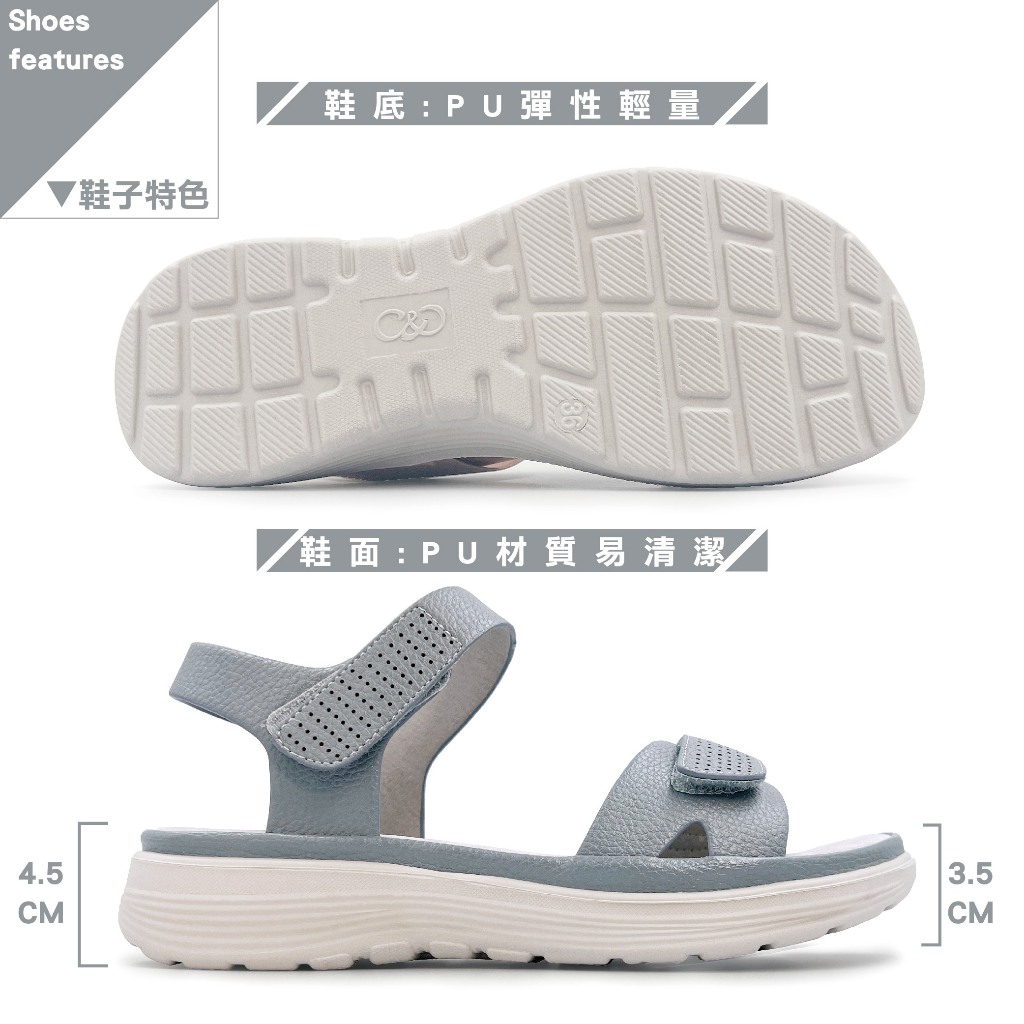 C&D 女鞋 魔鬼氈PU皮革彈性緩震厚底舒適涼鞋 C-1293灰藍,36|灰藍,37|灰藍,38|灰藍,39|灰藍,40|奶茶,36|奶茶,37|奶茶,38|奶茶,39|奶茶,40Flat SandalsC&D SHOES