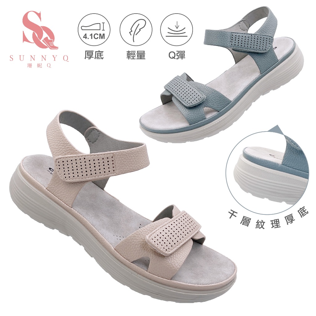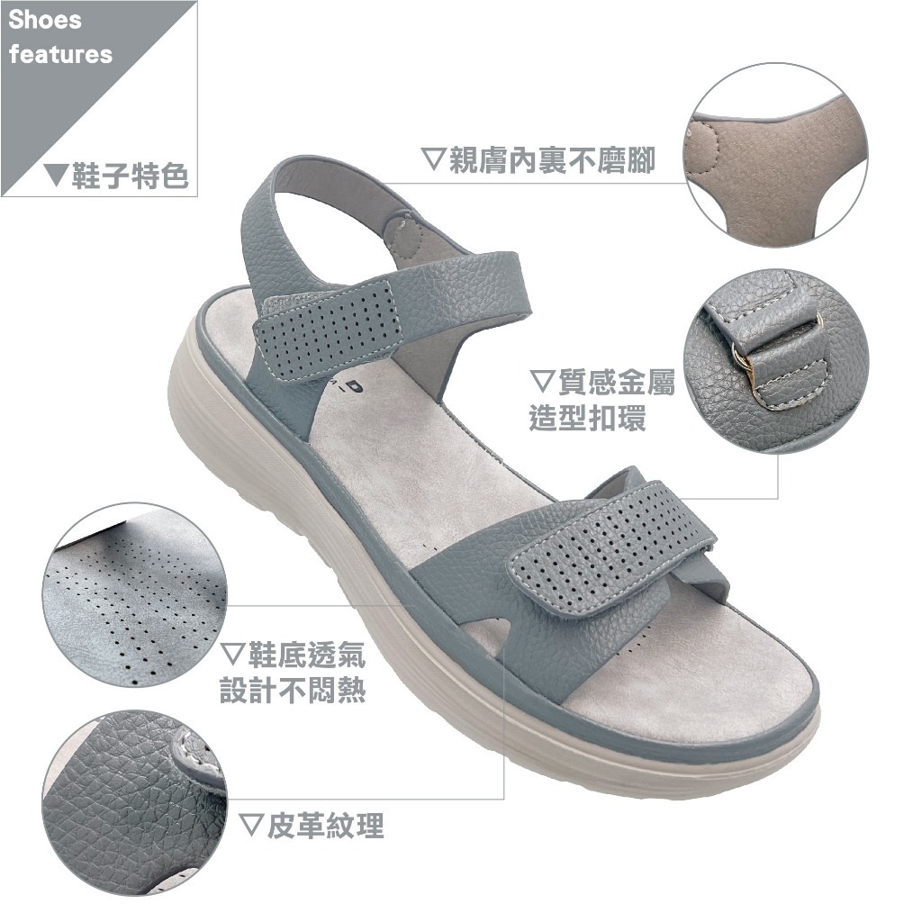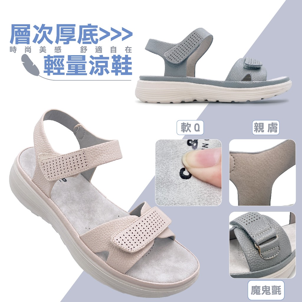 C&D 女鞋 魔鬼氈PU皮革彈性緩震厚底舒適涼鞋 C-1293灰藍,36|灰藍,37|灰藍,38|灰藍,39|灰藍,40|奶茶,36|奶茶,37|奶茶,38|奶茶,39|奶茶,40Flat SandalsC&D SHOES