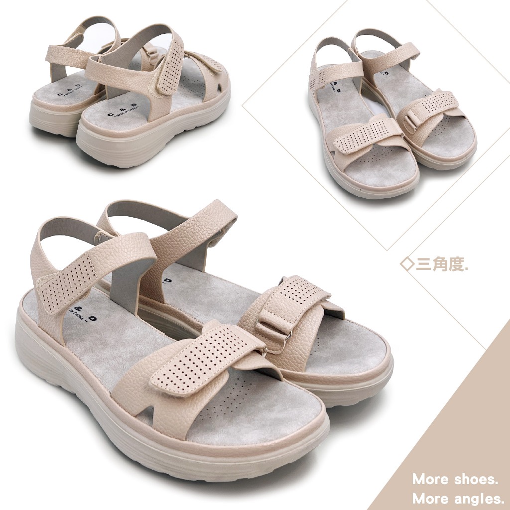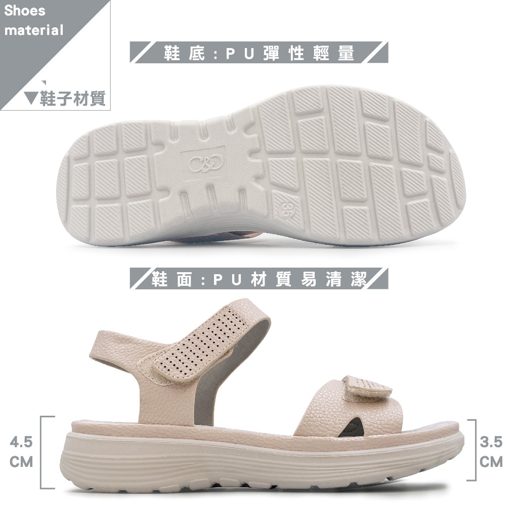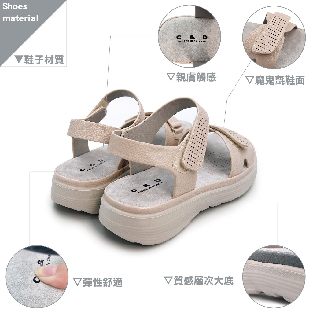 • C&D 女鞋 魔鬼氈PU皮革彈性緩震厚底舒適涼鞋 C-1293