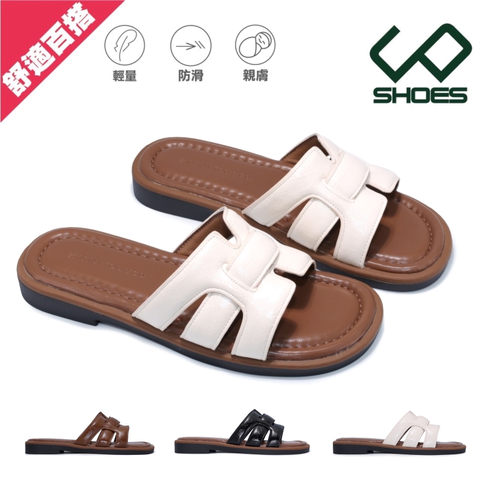 • C&D 女鞋 時尚小香風全掌軟墊亮皮休閒拖鞋 平底拖鞋 微跟鞋