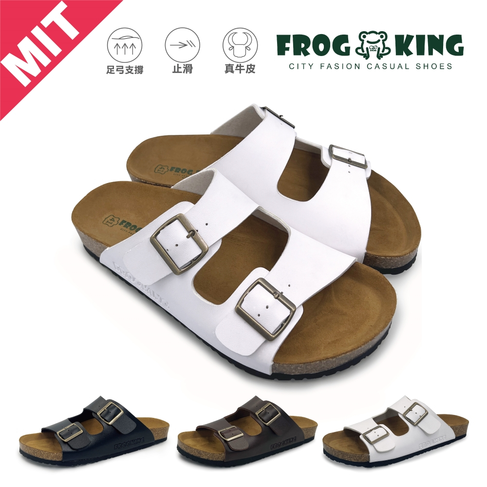• FROGKING MIT 情侶款 經典雙釦足弓不死硬底拖鞋 真皮中底 新型米糠底 足底筋膜炎 男鞋 女鞋 F-205