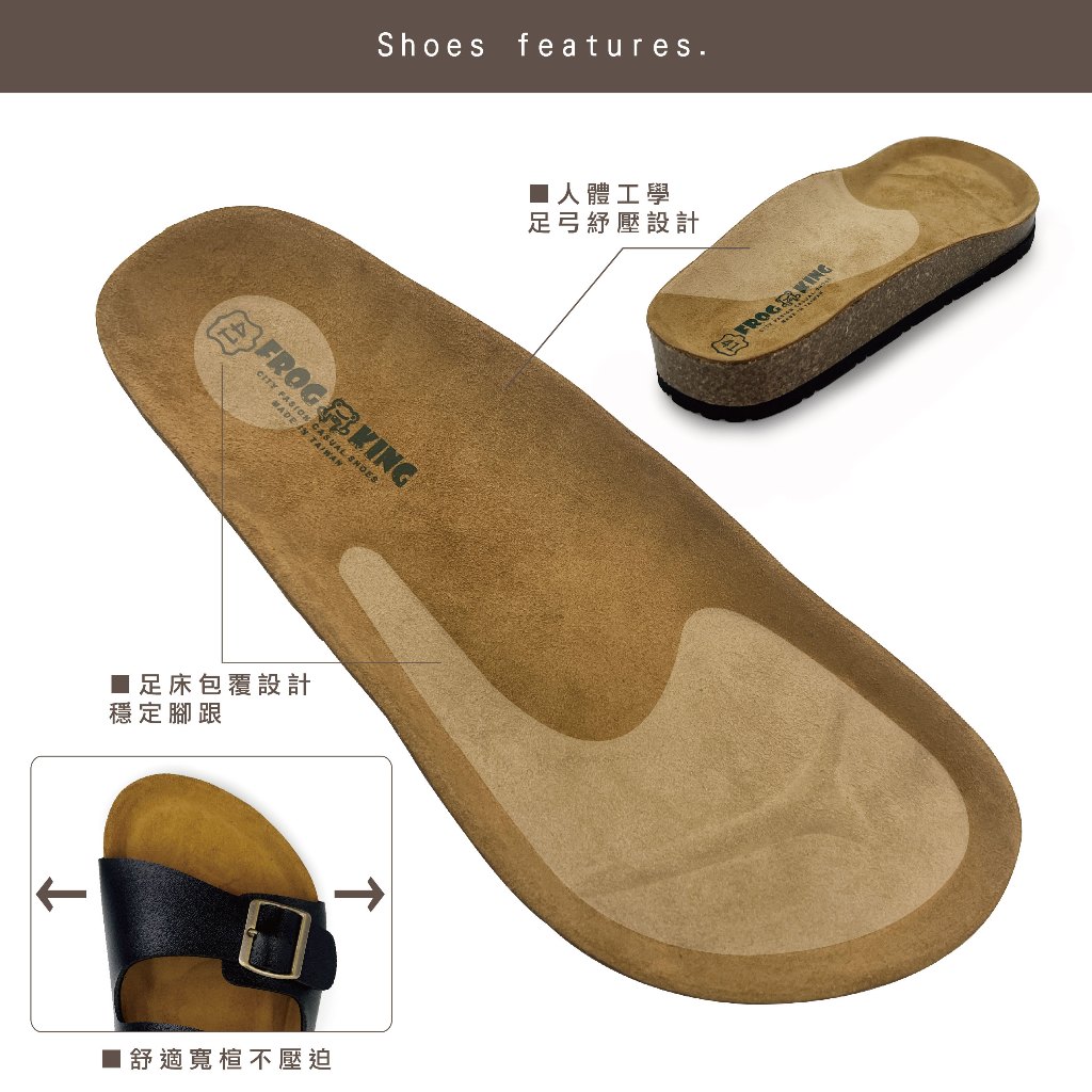 FROGKING MIT 情侶款 經典雙釦足弓不死硬底拖鞋 真皮中底 新型米糠底 足底筋膜炎 男鞋 女鞋 F-205