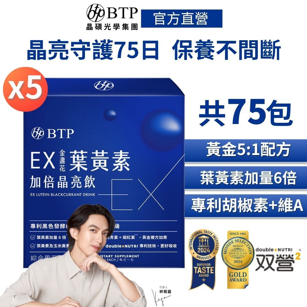 【BTP】EX金盞花葉黃素加倍晶亮飲(15入/盒)x5盒 囤貨組 林宥嘉代言 游離型葉黃素 專利黑色發酵精華 玻尿酸【BTP】EX金盞花葉黃素加倍晶亮飲(15入/盒)x5盒 囤貨組 林宥嘉代言 游離型葉黃素 專利黑色發酵精華 玻尿酸Well BeingBTP晶澈 | 晶碩光學集團