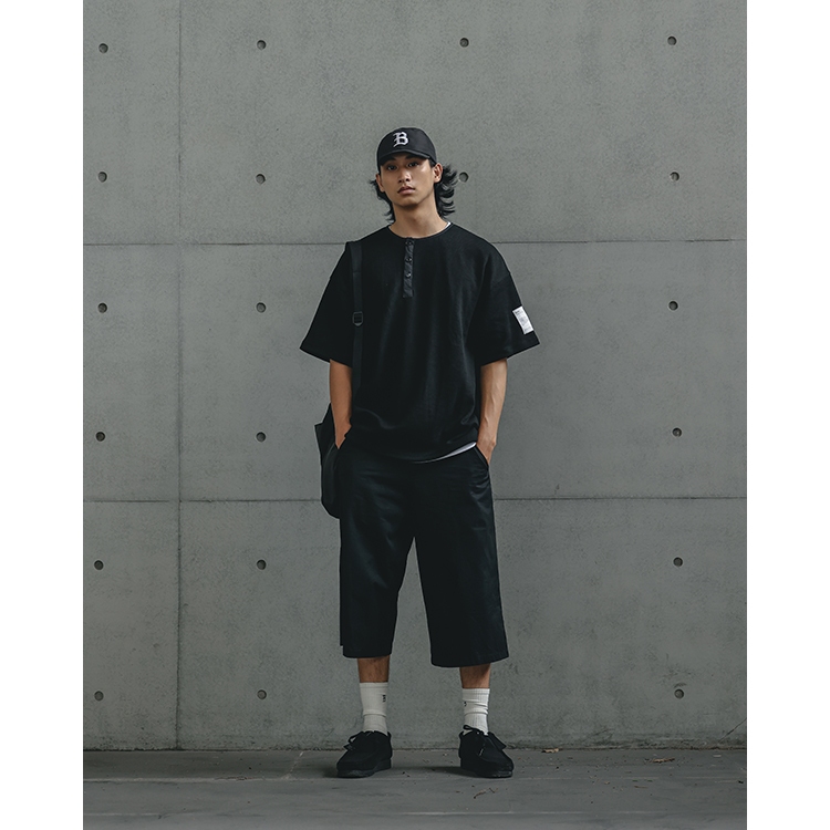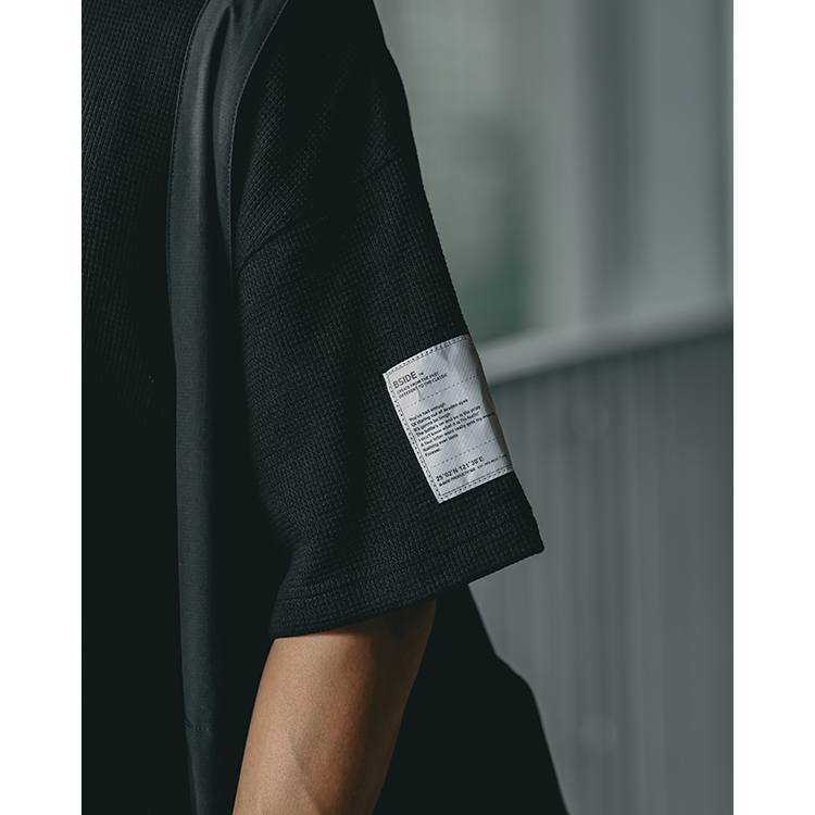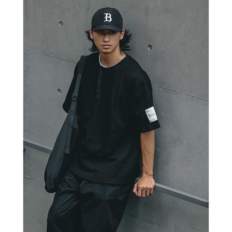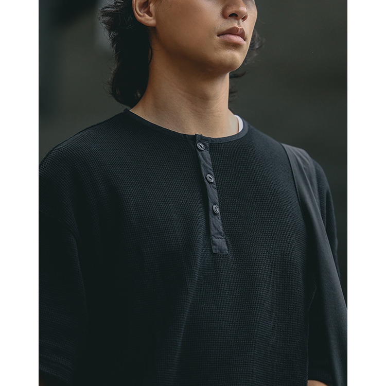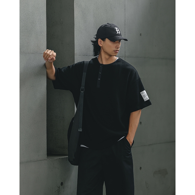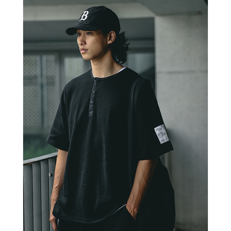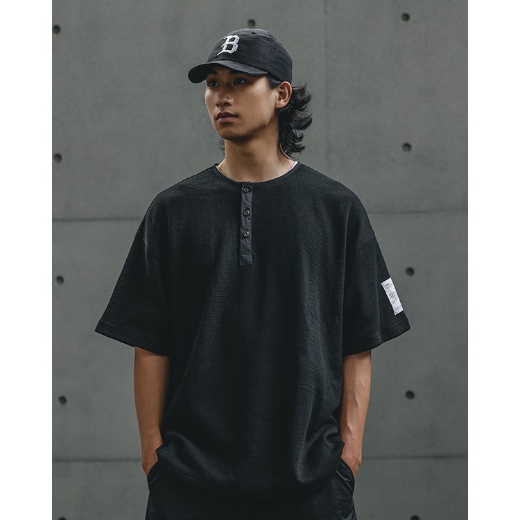 [B-SIDE]WAFFLE HENLEY NECK WIDE TEE重磅華夫格開扣圓領寬版短T 黑色M|L|XLT-ShirtsB-SIDE OFFICIAL ONLINE STORE