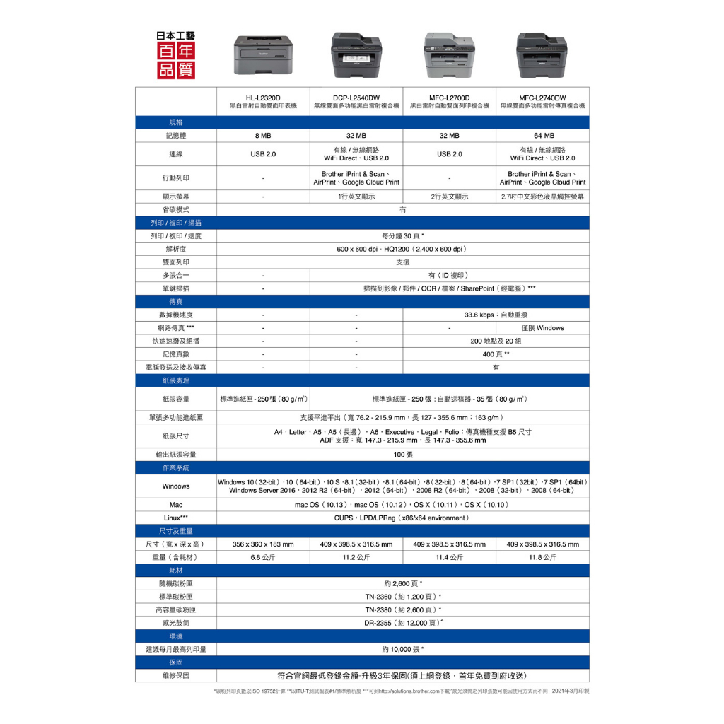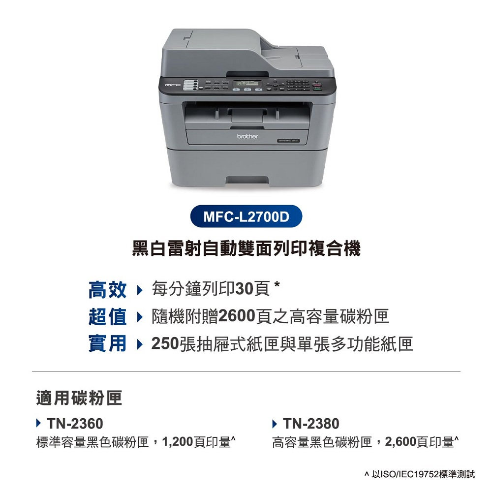 (機+2組碳粉) brother MFC-L2700D 傳真事務機 MFC2700D+TN2360X2機+2支原廠碳粉_TN2360X2_保3|單機_(內含原廠隨機碳粉)Printers, Scanners & Photocopy Machinesbrother兄弟旗艦館|特約經銷