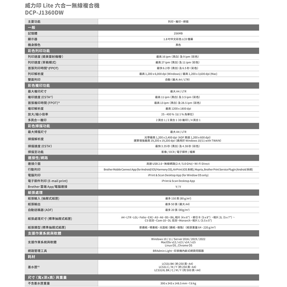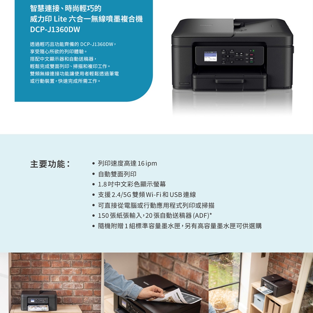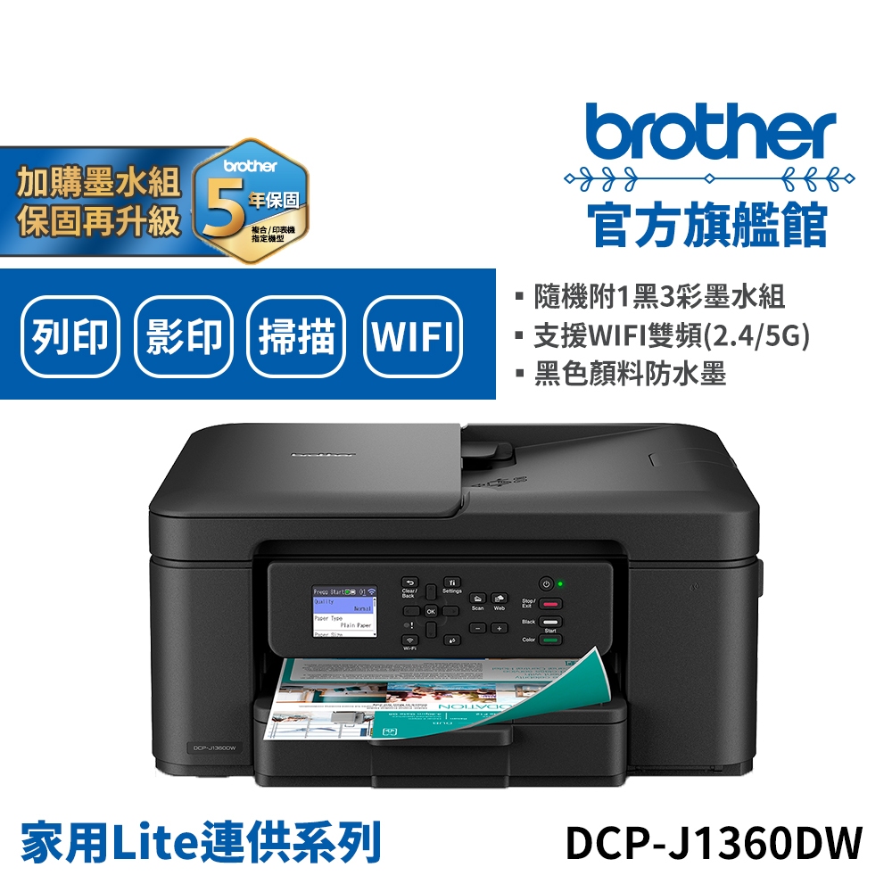 BROTHER DCP-J1360DW 威力印Lite雙面無線六合一噴墨複合機 單機 組合品 適用LC531四色墨匣DCP-J1360DW,不加購墨水組(單機/1年保固)|DCP-J1360DW,+LC531*1組(登錄好禮+5年保)|DCP-J1360DW,+LC531*2組(登錄好禮+5年保)|DCP-J1360DW,+LC531XL*1組(登錄好禮+5年)|DCP-J1360DW,+LC531*3組(登錄好禮+5年保)|DCP-J1360DW,+LC531XL*3組(登錄好禮+5年)Printers, Scanners & Photocopy MachinesBROTHER 官方旗艦館