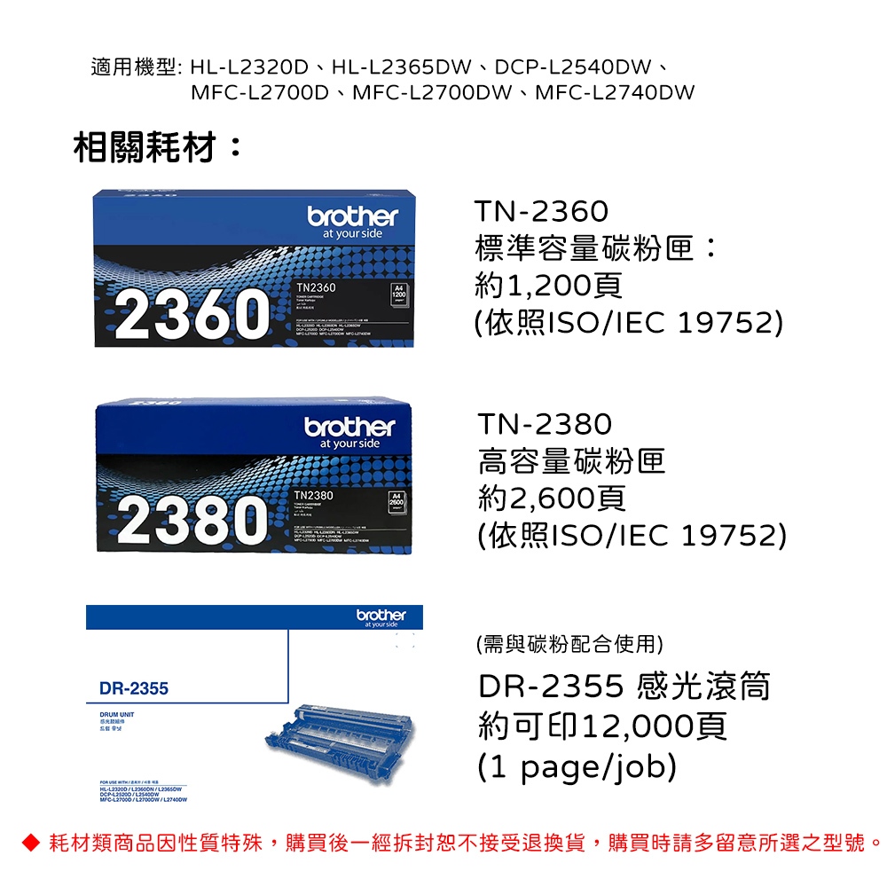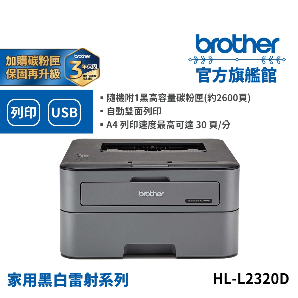 BROTHER HL-L2320D 高速黑白雷射自動雙面印表機 單機 組合品 適用碳粉TN-2360/TN-2380HL-L2320D,+TN2360碳2支(登錄好禮+3年保)|HL-L2320D,+TN2380碳2支(登錄好禮+3年保)|HL-L2320D,不加購碳粉(單機特惠價/1年保固)|HL-L2320D,+TN2360碳1支(登錄好禮+3年保)|HL-L2320D,+TN2380碳1支(登錄好禮+3年保)Printers, Scanners & Photocopy MachinesBROTHER 官方旗艦館