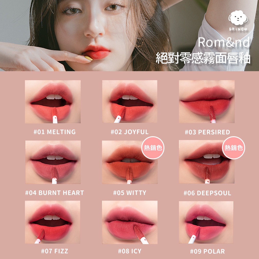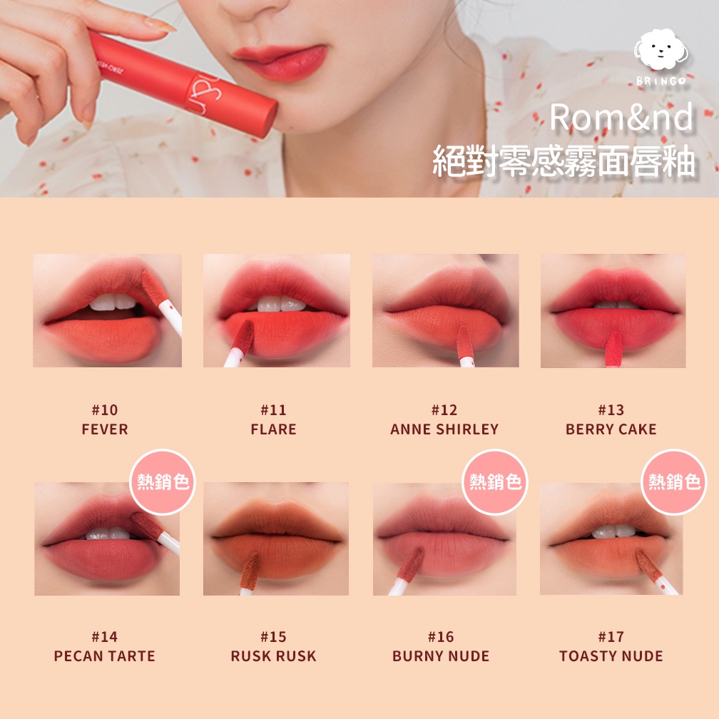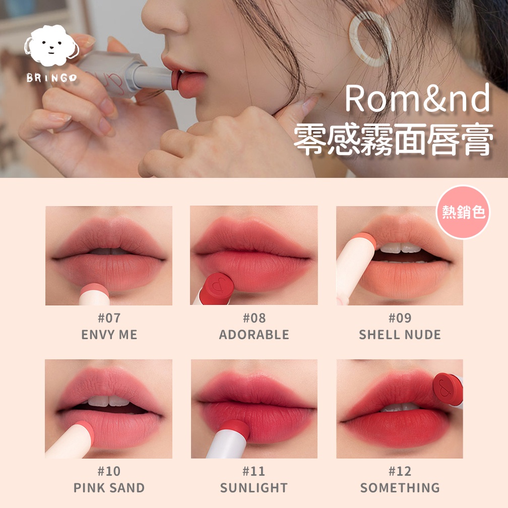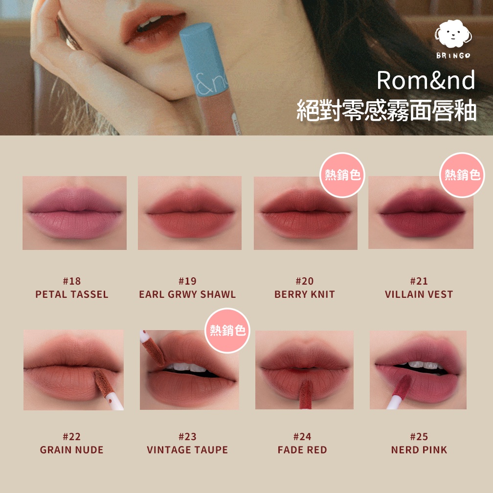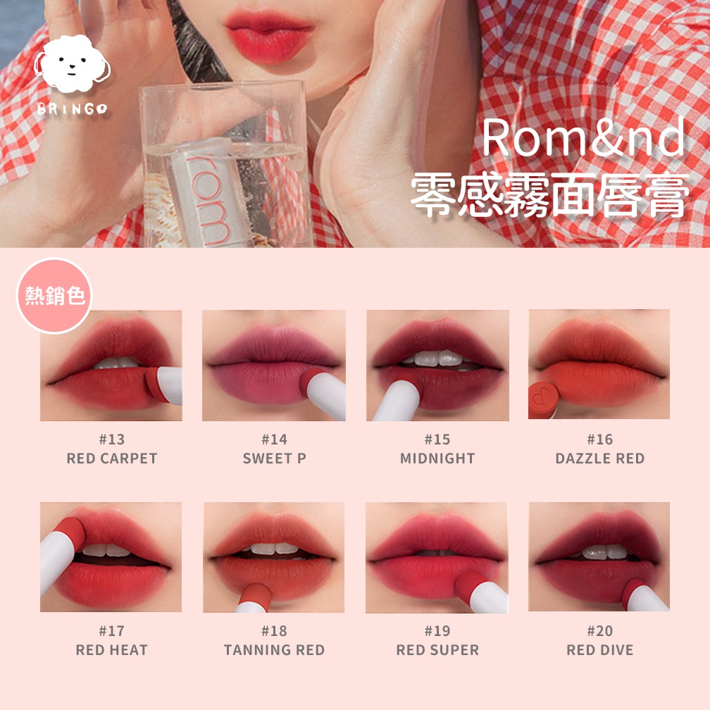 【Rom&nd】絕對零感霧面唇膏 灰管 粉管 romand16🔸炫目紅 DAZZLE RED|18🔸TANNINGRED_26/04|19🔸夏日衝浪者 RED SURFER|10🔸粉紅沙灘_2025/07|03🔸剪影 SILHOUETTE|12🔸非凡 SOMETHING|14🔸甜蜜豌豆 SWEET P|17🔸燃燒紅(2025/7/31)|01🔸髒粉紅 DUSTY PINK|13🔸紅地毯 RED CARPET|04🔸日落黄昏(26/05)|05🔸夜晚 EVENING|07🔸羨慕 ENVY ME|09🔸裸色貝殼 SHELL NUDE|11🔸陽光 SUNLIGHT|15🔸午夜 MIDNIGHT|20🔸紅板跳水者(2026/3/13)|02🔸爵士年華 ALL THAT JA|06🔸精彩 AWESOME_26/04|秋冬新色🍂21# 煙燻肉桂|秋冬新色🍂 22# 焦芋豆沙|08🔸可愛 ADORABLE|日本限定色 23🔸Ruddy NudeLipsBRINGO 商城旗艦館