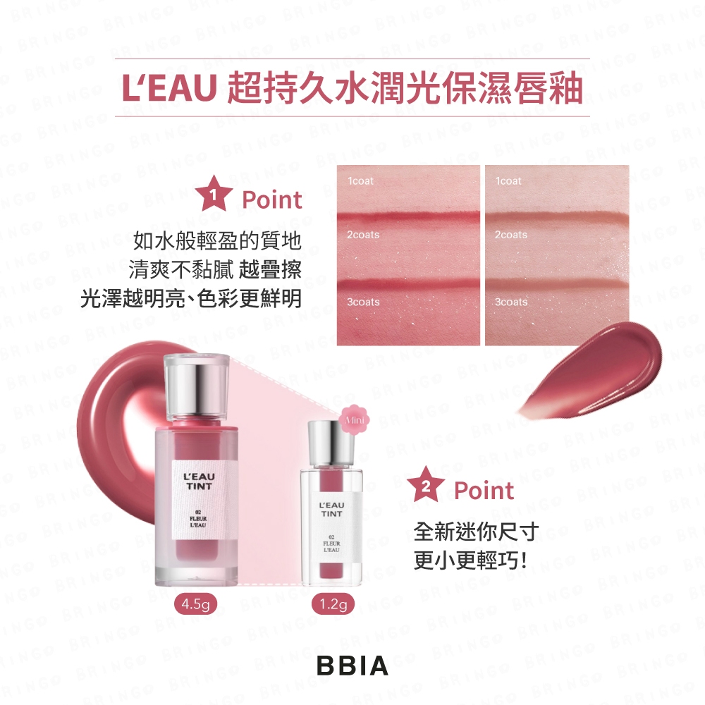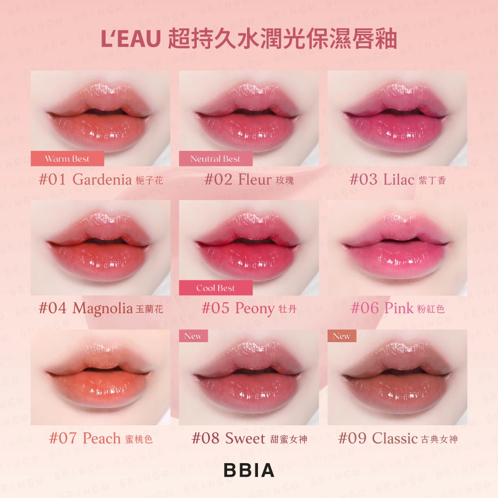 【BBIA】L’EAU 超持久水潤光保濕唇釉 4.5g 1.2g 亮澤唇釉 水光唇釉 迷你唇釉 唇釉 唇彩07 蜜桃色 PEACH L’EAU|01 梔子花GARDENIA L’EAU|02 玫瑰 FLEUR L’EAU|03 紫丁香 LILAC L’EAU|04 玉蘭花MAGNOLIA L’EAU|05 牡丹 PEONY L’EAU|迷你01 梔子花 GARDENIA|迷你02 玫瑰 FLEUR L’EAU|迷你03 紫丁香 LILAC L’EAU|迷你04 玉蘭花 MAGNOLIA|迷你05 牡丹 PEONY L’EAU|迷你06 粉紅色 PINK L’EAU|迷你07 蜜桃色 PEACH L’EAU|迷你08 甜蜜女神 SWEET|迷你09 古典女神 CLASSICLipsBRINGO 商城旗艦館