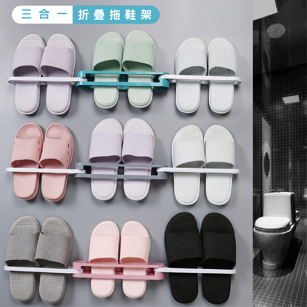 一變三折疊壁置物鞋架 浴室免打孔可折疊拖鞋架 壁掛毛巾架 壁掛折疊鞋架 三合一摺疊_DH051灰(一變三)HooksFS生活品專賣