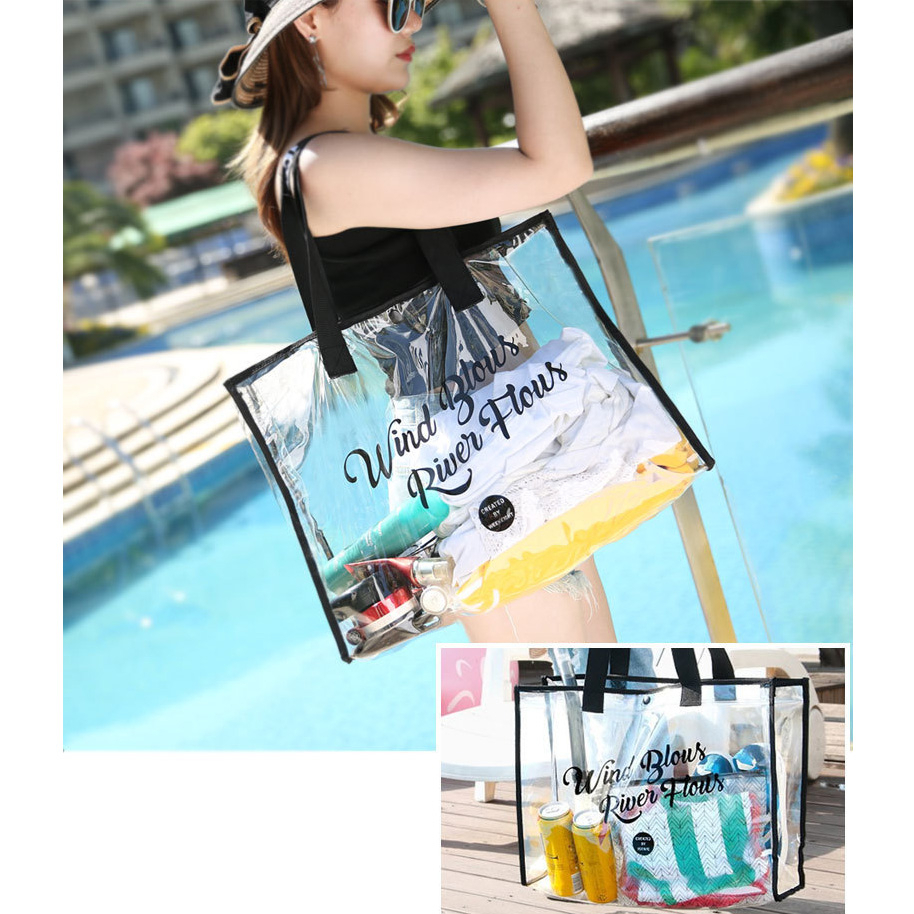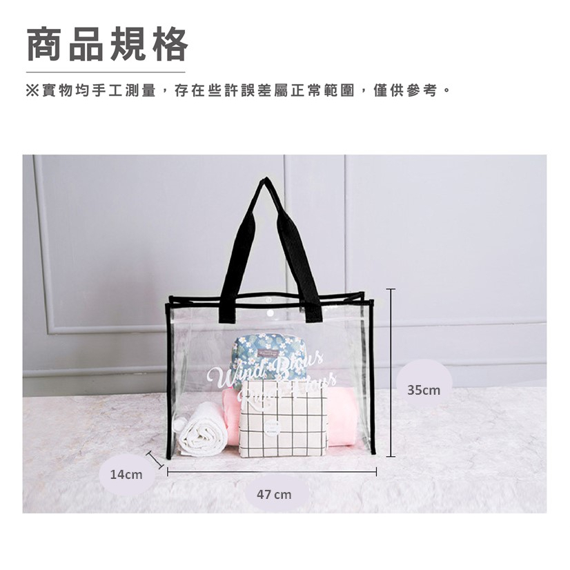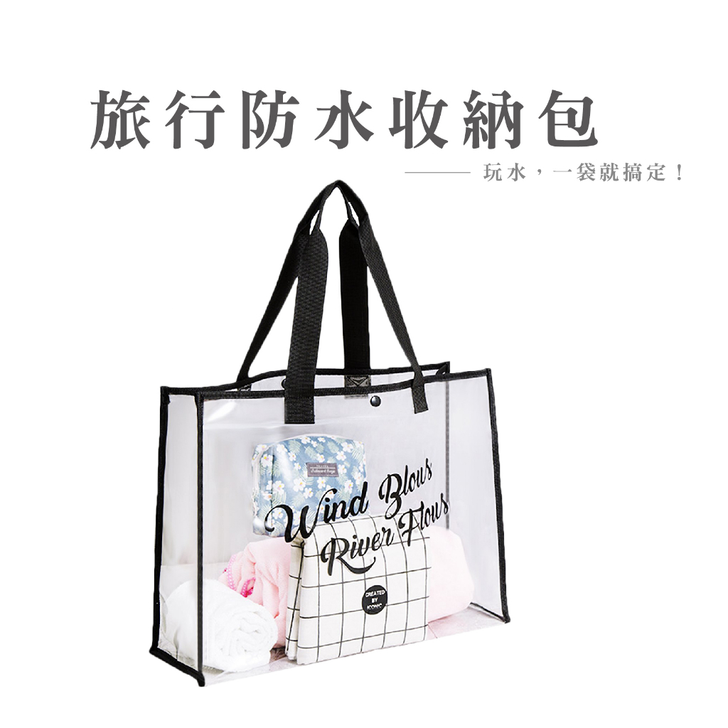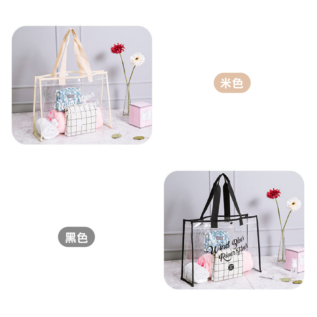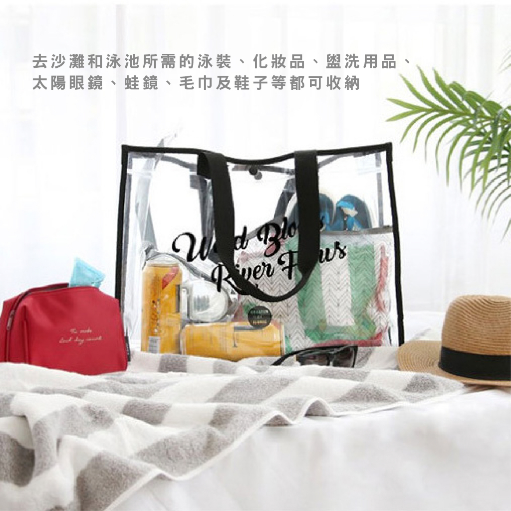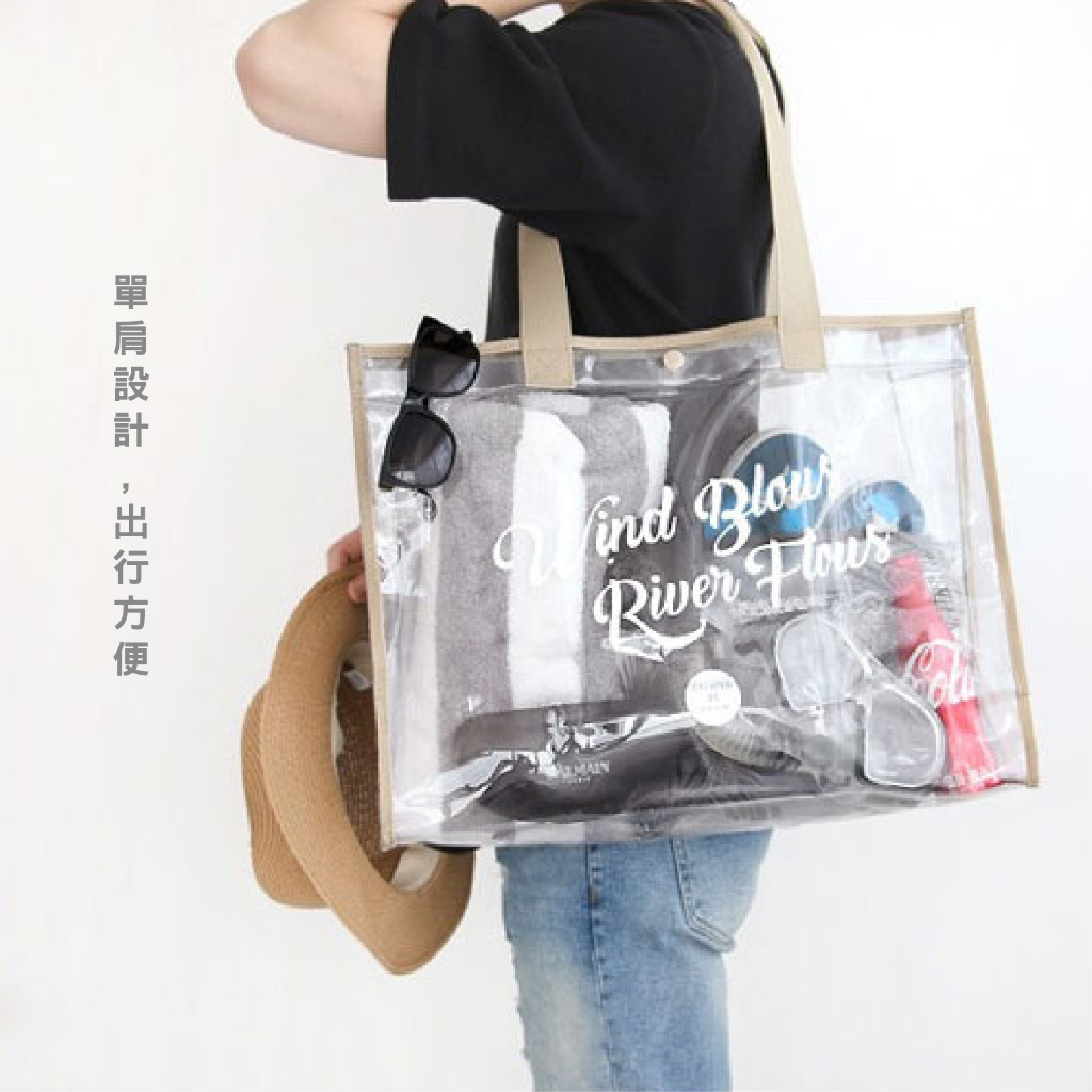 防水大容量手提收納包 單肩手提包 透明 英文 時尚 休閒百搭 海灘包 購物袋_BJ251扣子款_米|扣子款_黑FS生活品專賣